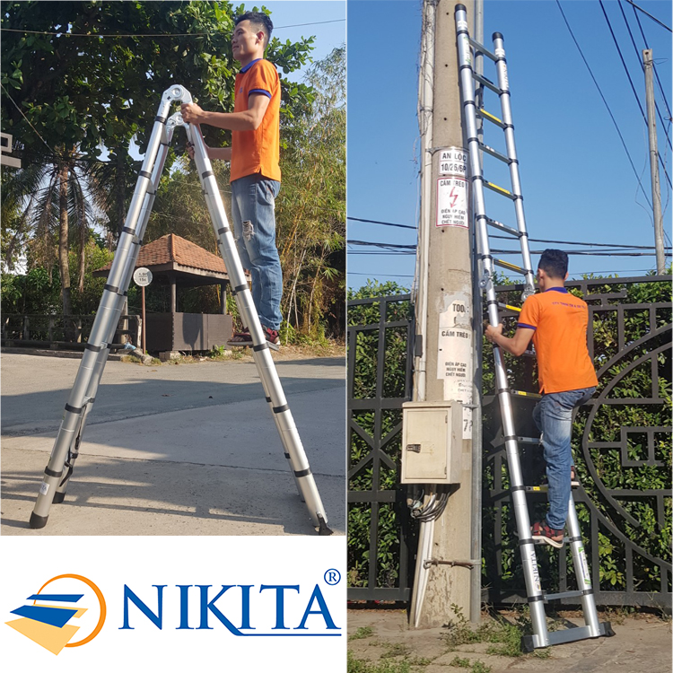 Thang nhôm rút NIKITA: có thể được điều chỉnh chiều cao một cách linh hoạt, phù hợp với nhiều nhu cầu sử dụng khác nhau. Chiều cao thang có thể lên tới 6m, đáp ứng được các công việc đòi hỏi độ cao lớn.