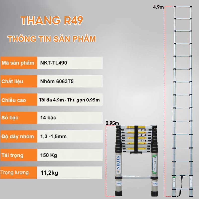 Thang Nhôm Rút Thợ Điện Nikita R49, Chữ I Max 4.9m, Trọng Lượng 13kg, CỨNG CẤP ỔN ĐỊNH