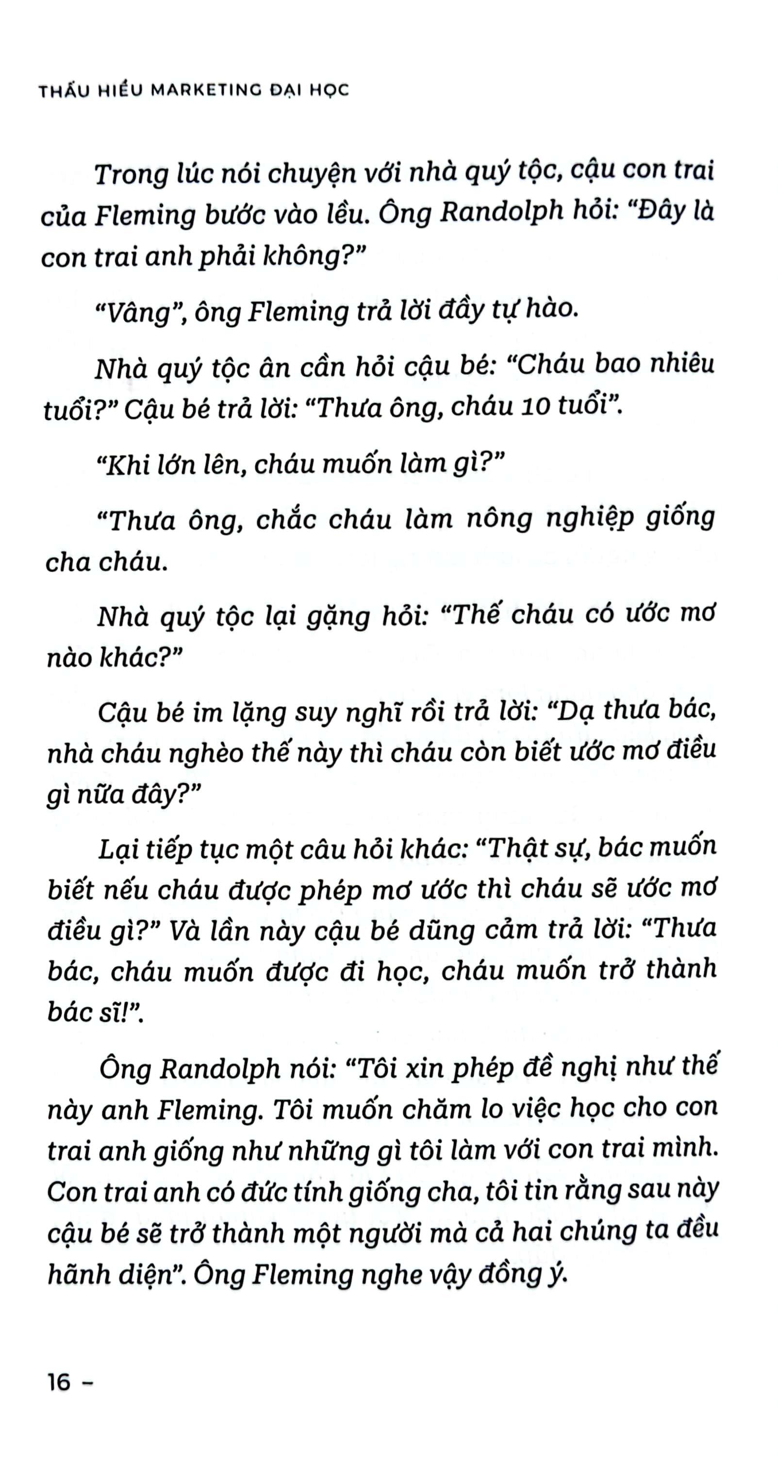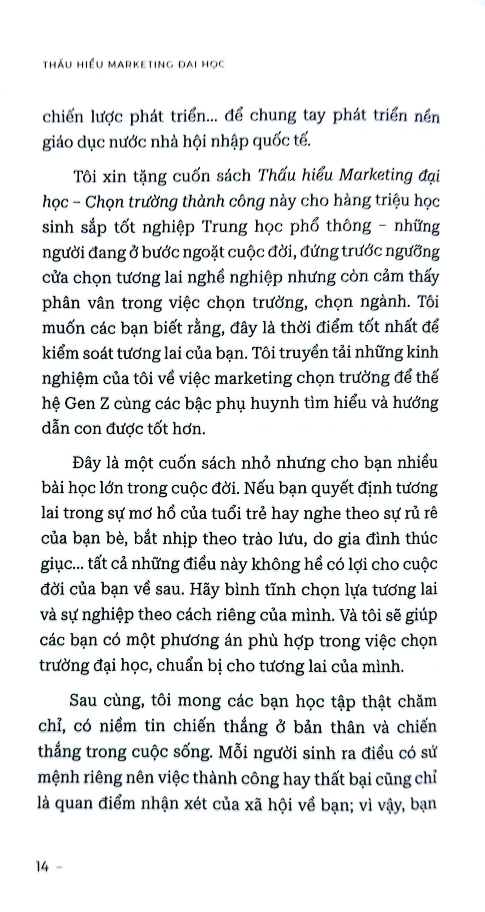 Mua tại TiktokThấu Hiểu Marketing Đại Học Thấu hiểu Marketing Đại học là một cuốn cẩm nang về tiếp thị giáo dục, tác giả của cuốn sách là Phillip Lam – người đã có 15 năm kinh nghiệm hoạt động trong lĩnh vực tiếp thị giáo dục. Cách tiếp cận của tác giả về tiếp thị giáo dục được đúc kết từ thực tiễn công việc. Theo tác giả, khi mỗi cá nhân đều có chuyên môn nghề nghiệp vững vàng, ổn định, họ sẽ có nhiều cơ hội nâng cao chất lượng cuộc sống cá nhân. Ở một góc độ khác, tiếp thị giáo dục có hiệu quả sẽ tạo ra một lực lượng lao động có định hướng rõ ràng, do họ có năng lực nghề nghiệp tốt, làm tăng năng suất lao động, góp phần cho sự phát triển phồn vinh của đất nước: