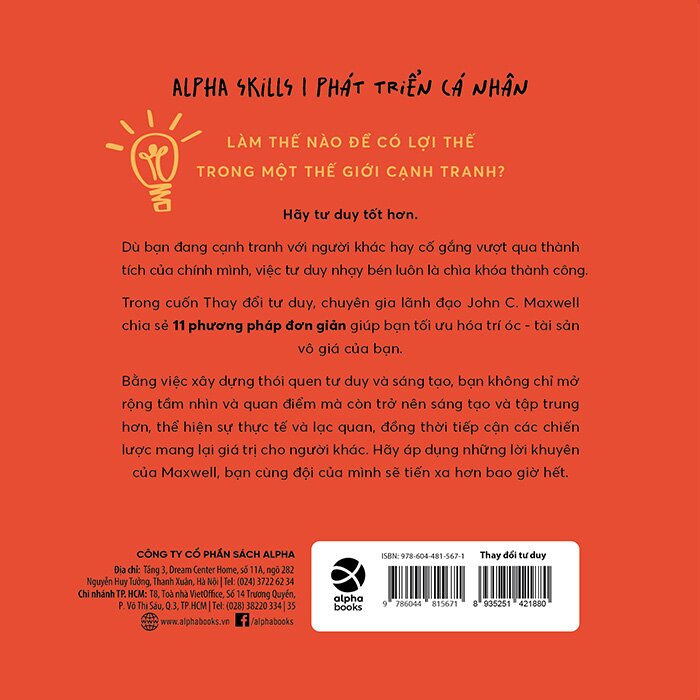 - Người tìm kiếm sự cải thiện cá nhân: Phát triển tư duy và kỹ năng để đạt mục tiêu cá nhân. Cuốn sách Thay Đổi Tư Duy có gì đặc biệt Làm thế nào để bạn có thể đạt được lợi thế trong một thế giới cạnh tranh? Dù bạn đang cạnh tranh với chính mình hay với người khác, thì việc suy nghĩ đúng đắn chính là chìa khóa. Trong "The Thinker's Edge", tác giả bán chạy quốc tế và chuyên gia lãnh đạo John C. Maxwell chia sẻ 11 phương pháp đơn giản để giúp bạn suy nghĩ hiệu quả hơn và trở thành phiên bản tốt hơn của chính mình. Bằng cách phát triển tư duy và góc nhìn sáng tạo, bạn sẽ trở nên sáng tạo và linh hoạt hơn trong chiến lược, đồng thời biết tiếp thu và đánh giá cao người khác. Hãy làm theo lời khuyên của Maxwell, và bạn cùng đội ngũ của mình sẽ đạt được thành tích vượt trội. Trích đoạn sách Thay Đổi Tư Duy “HỌC HỎI TỪ MỌI TRẢI NGHIỆM Đừng ngủ quên trên thành công. Đừng tập trung vào chúng. Thay vào đó, hãy học từ chúng. Và quan trọng hơn, hãy học từ những thất bại mình phạm phải. Khả năng chấp nhận được dạy dỗ là chìa khóa để nhìn được rộng hơn, sâu hơn và xa hơn. Bạn càng có nhiều trải nghiệm đa dạng trong cuộc sống thì càng có nhiều tiềm năng học hỏi. Hãy thử thật nhiều thứ. Hãy nắm bắt thật nhiều cơ hội. Hãy khám phá. Sau mỗi trải nghiệm, hãy dành thời gian để suy ngẫm. Kinh nghiệm không phải là người thầy tốt nhất – kinh nghiệm được đánh giá mới là người thầy tốt nhất.” “LÀM QUEN VỚI SỰ BẤT TIỆN Đi theo đám đông thật tiện. Ở cạnh những người đồng tình với mình thật tiện. Nó giống như ngồi trên một chiếc ghế tựa cũ đã được điều chỉnh cho phù hợp với mọi đặc điểm riêng của bạn. Suy nghĩ khác với những người khác lại không hề tiện. Hãy làm quen với nó.” “Sau mỗi trải nghiệm, hãy dành thời gian để suy ngẫm. Kinh nghiệm không phải là người thầy tốt nhất – kinh nghiệm được đánh giá mới là người thầy tốt nhất.” “Lần tới khi bạn chuẩn bị đi theo lối suy nghĩ phổ biến về một vấn đề nào đó, hãy chọn đừng tuân theo một cách mù quáng. Ngừng lại. Suy nghĩ. Đặt câu hỏi. Còn cách nào tốt hơn không? Hãy đi theo hướng đó, bất kể người khác có đang làm gì. Hãy cứ để họ bảo là bạn sai rồi. Hãy cứ để họ gọi bạn là đồ ngốc. Hãy cứ để họ nói về những việc họ sẽ làm. Hãy trở nên không phổ biến. Nhưng hãy đến nơi bạn cần đến để làm điều đúng đắn và thành công.” “ĐỪNG ĐA NHIỆM Do nhịp độ hối hả trong văn hóa của chúng ta, bạn có thể muốn làm nhiều việc cùng một lúc. Đừng làm thế. Việc chuyển từ nhiệm vụ này sang nhiệm vụ khác có thể khiến bạn mất tới 40% hiệu suất. Nó phá vỡ sự tập trung của bạn.” “Các nghiên cứu về tính sáng tạo cho thấy biến số lớn nhất quyết định liệu nhân viên có sáng tạo hay không là ở chỗ họ có nhận thấy mình được phép hay không.” - David Hills Thông tin tác giả John C. Maxwell Là chuyên gia Số 1 Thế Giới về nghệ thuật lãnh đạo doanh nghiệp, truyền thụ những cách thức xây dựng đội ngũ lãnh đạo hiệu quả hướng tới kết quả tối ưu cho doanh nghiệp. Là tác giả của nhiều cuốn sách gối đầu cho các CEO lừng danh trên thế giới như: 21 phẩm chất vàng của nhà Lãnh đạo, Tinh hoa Lãnh đạo, Lãnh đạo 360,… Cho tới nay John C.Maxwell đã huấn luyện cho hơn 6 triệu nhà lãnh đạo doanh nghiệp, là nhà đạo tạo lãnh đạo cao cấp cho Top 500 Công ty hàng đầu Thế giới, được nhiều Hiệp hội và các Tạp chí có uy tín trên Thế giới vinh danh là GURU Số 1 Thế giới về nghệ thuật Lãnh đạo.