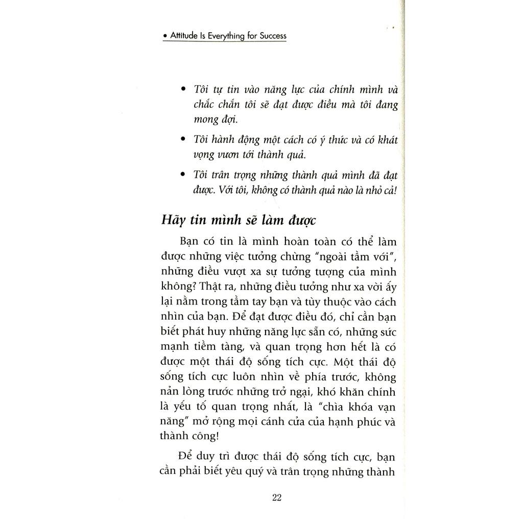 Cuốn sách nhấn mạnh một thái độ sống tích cực sẽ giúp bạn luôn lạc quan, yêu đời, tự tin để vượt qua mọi khó khăn, thử thách trong công việc và đời sống. Ngược lại, một thái độ sống tiêu cực sẽ đóng chặt bạn vào những suy nghĩ, cách nhìn phiến diện, vị kỷ, tự ti, đau khổ và dễ dàng đầu hàng trước thất bại, bất hạnh. Chính thái độ của bạn sẽ có tác động sâu sắc đến mọi khía cạnh trong cuộc sống và quyết định kết quả, thành công mọi việc bạn làm.