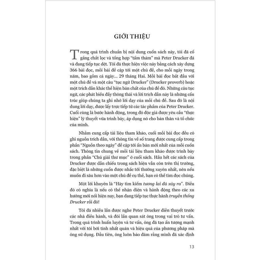 Đọc cuốn sách này cũng giống như bạn đang có một nhà tư vấn về quản trị theo hướng thực hành nhất và khôn khéo nhất thế giới ngồi cạnh bên, cung cấp những lời khuyên vàng ngọc và vô tận. The Daily Drucker dành cho bất cứ ai muốn hiểu và ứng dụng các ngôn từ cũng như ý tưởng mạnh mẽ của Drucker.