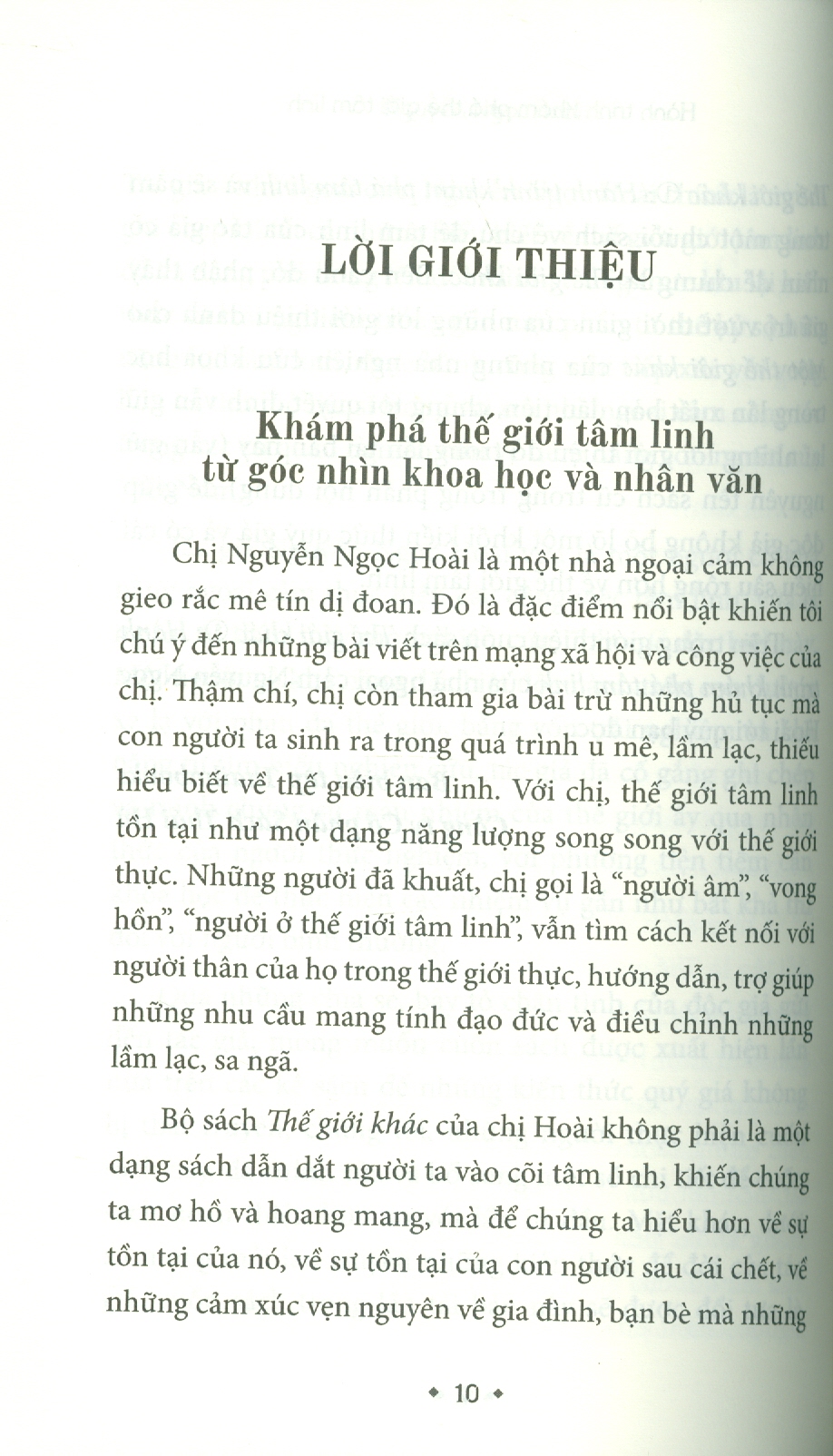 "Thế giới khác 1: Hành trình khám phá thế giới tâm linh" chính là một phần minh chứng cho sự tồn tại của một thế giới tâm linh hiện diện qua từng con chữ. Thế giới tâm linh tồn tại. Thế giới ấy không phải là sự huyễn hoặc của tâm tưởng và niềm tin một chiều của con người, hay qua sự thêu dệt của dân gian, hay chỉ là lớp áo dày và trang trọng khoác bên ngoài các lễ nghi, tập tục như một văn hóa lâu đời của con người, bất chấp niềm tin và tư tưởng ngược chiều của con người vào vô thần và hữu thần.