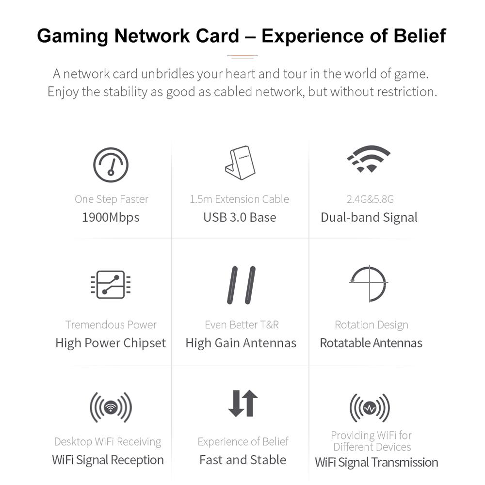 Featuring 1900Mbps dual-band high speed transmission rate, the networkcard is applied with high standard. Wifi speed and stability is promoted. Itsperformance becomes even better when used with pro-level gaming computers.