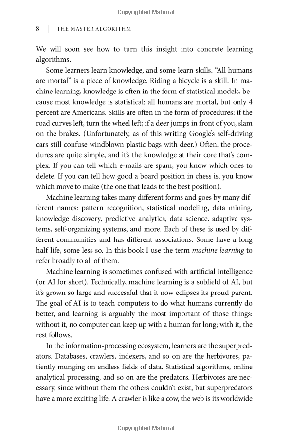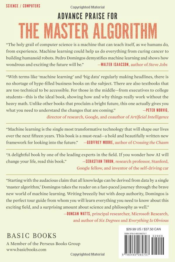 Pedro Domingos demystifies machine learning and shows how wondrous and exciting the future will be' Walter Isaacson, author of Steve Jobs Society is changing, one learning algorithm at a time, from search engines to online