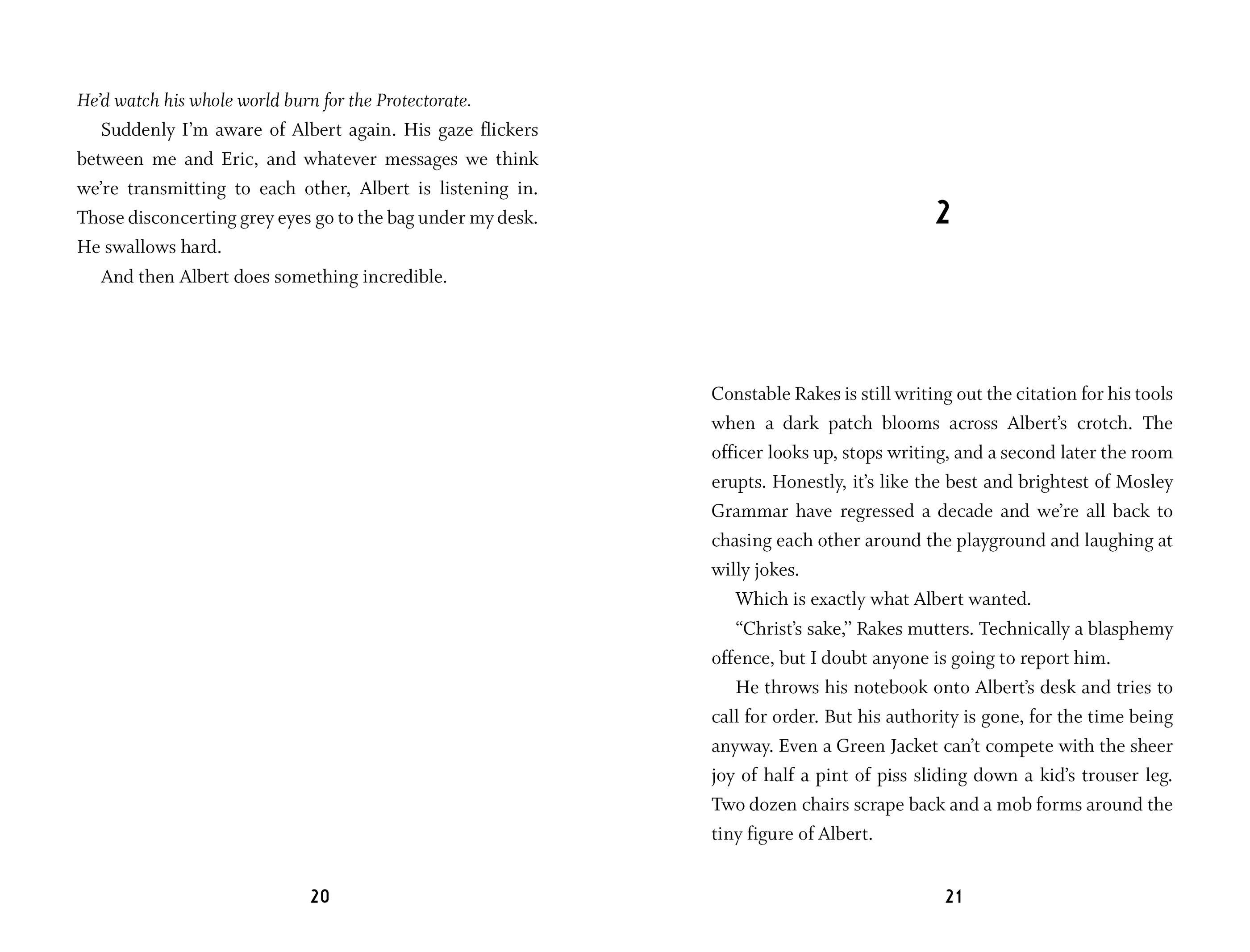 Welcome to England, where the Protectorate enforces the Public Good. Here, there are rules for everything - what to eat, what to wear, what to do, what to say, what to read, what to think, who to obey, who to hate, who to love. Your safety is assured, so long as you follow the rules.