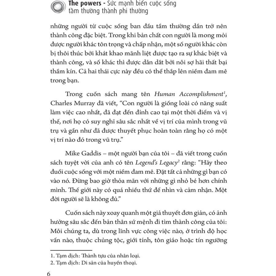 Cuốn sách này chính là di sản tôi truyền lại cho những người có thể cần được động viên trên con đường hướng đến định mệnh của họ. Tôi hy vọng bạn sẽ thấy những Sức mạnh mà tôi khám phá được là hữu ích đối với hành trình của cá nhân bạn. Khi đọc sách, bạn sẽ được truyền cảm hứng để khám phá những điều khả thi trong cuộc sống, đặt ra những mục tiêu lớn, phát triển những kỹ năng cần thiết để đạt được – rồi vượt xa – tất cả những mục tiêu đó. Bạn có tầm nhìn về tương lai của mình không? Bạn có muốn biết cách làm thế nào để từ người quan sát cuộc sống thành người ảnh hưởng, người thực hiện trong một lĩnh vực lớn hơn tất cả những gì bạn có thể tưởng tượng không?