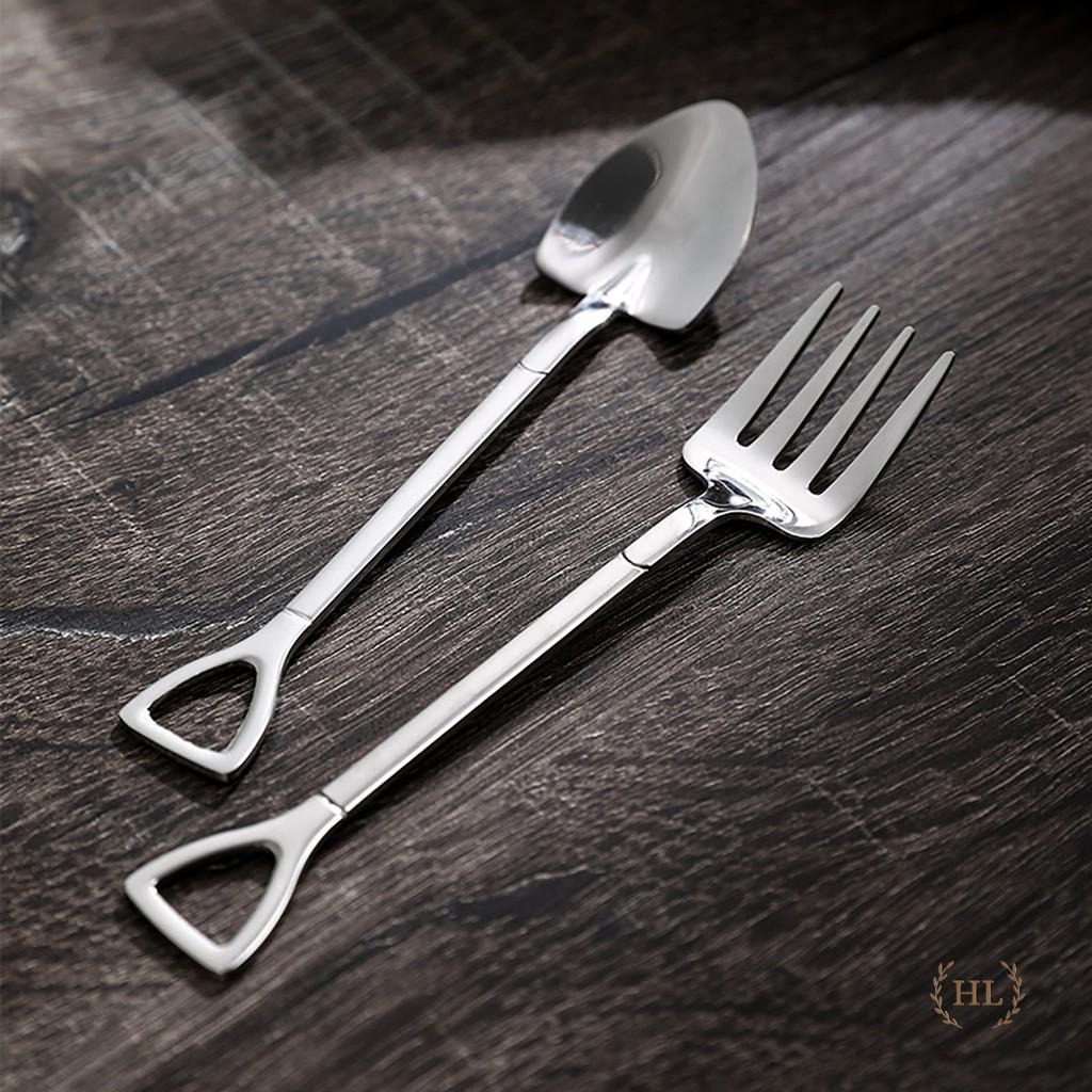 Thìa nĩa inox được tạo hình xẻng và bồ cào 4 răng cho ta gợi nhớ về khung cảnh nông thôn thời thơ ấu.