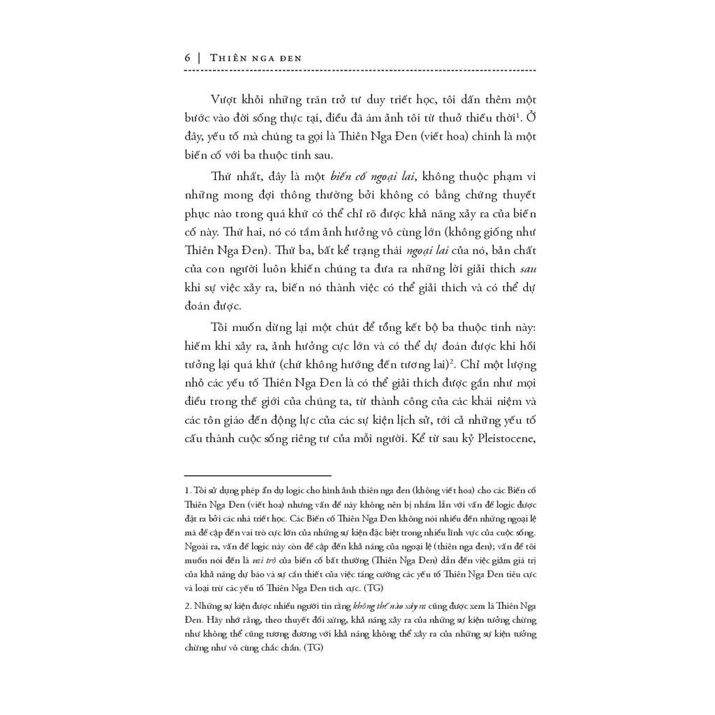 Chúng ta không biết rất nhiều thứ nhưng lại hành động như thể mình có khả năng dự đoán được mọi điều. Và trong cuốn sách này, tác giả Nassim Nicholas Taleb đã đi sâu vào khai thác những sai lầm của tư tưởng cố hữu ấy. Theo ông, “thiên nga đen” là một biến cố tưởng chừng như không thể xảy ra với ba đặc điểm chính: không thể dự đoán, có tác động nặng nề và sau khi nó xảy ra, người ta lại dựng lên một lời giải thích để khiến nó trở nên ít ngẫu nhiên hơn, dễ dự đoán hơn so với bản chất thật của nó. Thành công đáng kinh ngạc của Fb có thể được coi là một “thiên nga đen”, việc nước Anh rời khỏi Liên minh châu u cũng là một “thiên nga đen”. Thiên nga đen luôn ẩn hiện trong mọi mặt của cuộc sống với những tác động khó lường, theo cả hướng tiêu cực và tích cực.
