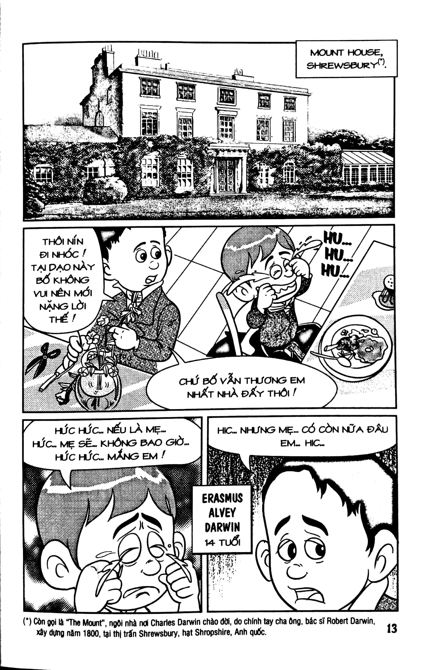 Thiên Tài Khoa Học Charles R. Darwin - amp; Thuyết Tiến Hóa Vĩ Đại Ngay từ thuở nhỏ, CHARLES R. DARWIN đã luôn say mê khám phá thế giới tự nhiên. Khi thì chạy nhảy khắp vườn, khi thì leo tít ngọn cây, niềm vui lớn nhất của Darwin lúc đó chính là thu thập tất tần tật mọi thứ, nào là côn trùng to nhỏ đủ loại, nào là đá sỏi đủ màu quý hiếm… Chính niềm đam mê mạnh mẽ này đã thôi thúc Darwin lên đường vượt đại dương bao la cùng chiếc tàu Beagle vào năm 1831. Suốt 5 năm trời, Darwin bôn ba thám hiểm khắp nơi, từ vùng đất Nam Mỹ hoang sơ đến quần đảo Galápagos kỳ bí, thu thập vô số tiêu bản động thực vật quý giá. Và cũng chính chuyến hải trình này đã giúp Darwin tìm được chiếc chìa khóa khai mở điều mà ông gọi là “bí ẩn của mọi bí ẩn”: nguồn gốc của muôn loài. Để rồi từ đó, Darwin phát triển nên một học thuyết làm chấn động cả thế giớ Thuyết tiến hóa. Với nét vẽ ngộ nghĩnh - sống động - hài hước, nội dung lôi cuốn bất ngờ, cùng vô số hình ảnh tư liệu phong phú, tập truyện tranh Charles R. Darwin & Thuyết tiến hóa vĩ đại thuộc bộ “Truyện tranh Khám phá – Thiên tài Khoa học” của công ty Phan Thị sẽ đưa bạn đồng hành cùng Darwin qua từng giai đoạn cuộc đời ông, từ thuở bé thơ đam mê côn trùng đến năm tháng cuối đời miệt mài nghiên cứu, để lại cho nhân loại những cống hiến vượt thời đại, trở thành một trong các thiên tài khoa học được vinh danh muôn đời .