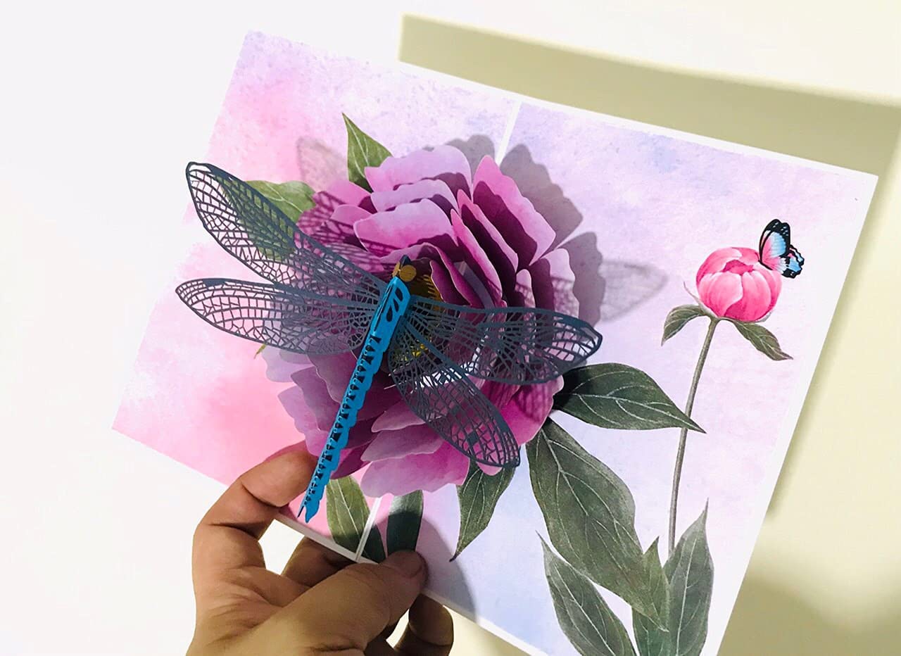 ✨Thiệp 3D Pop Up Chuồn Chuồn & Hoa Mẫu Đơn – Thiệp Hoa Nghệ Thuật, Thiệp Chúc Mừng, Sinh Nhật, F08