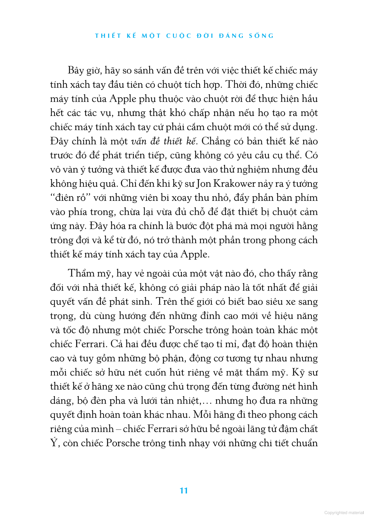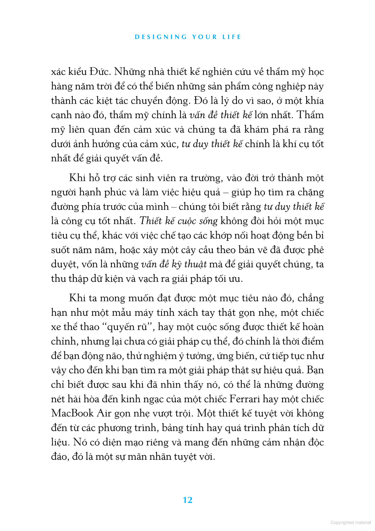 Đọc "Thiết kế một cuộc đời đáng sống", bạn đọc sẽ gặp những người trẻ lạc lối, những nhân vật "chưa biết phải làm gì với cuộc đời m.ình", những con người tài giỏi nhưng gặp khủng hoảng trong sự nghiệp, cuộc số Với mỗi câu chuyện và vấn đề, các tác giả ứng dụng phương pháp tư duy thiết kế để giải quyết, từ đó bạn sẽ học được cách áp dụng kiểu tư duy này vào giải quyết vấn đề của chính m.ình.