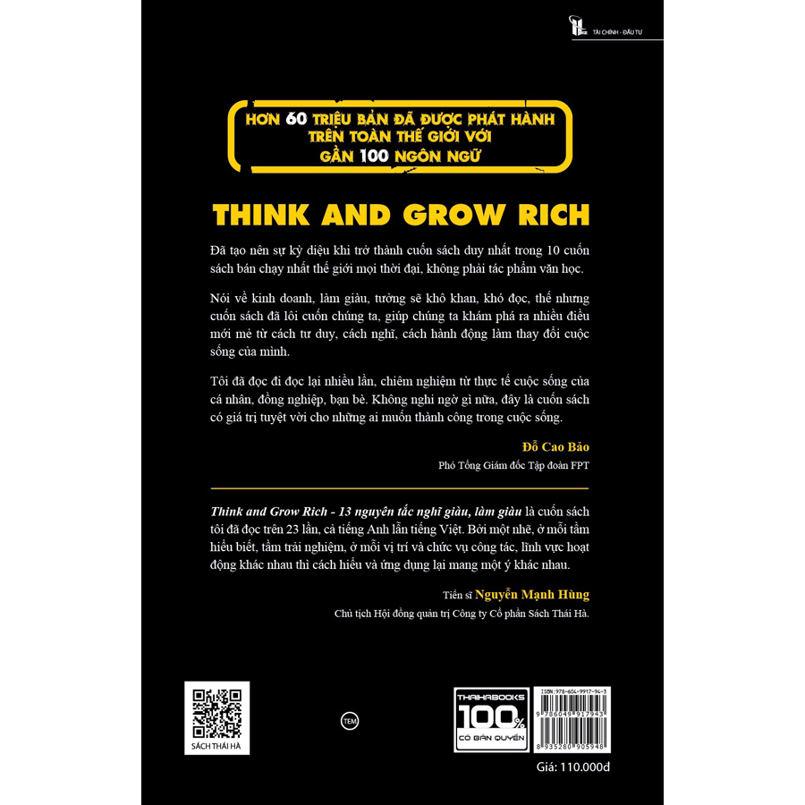 Think and grow rich – 13 nguyên tắc nghĩ giàu, làm giàu là cuốn sách “chỉ dẫn” duy nhất chỉ ra những nguồn lực bạn phải có để thành công. Mỗi chương trong cuốn sách đều đề cập đến bí quyết kiếm tiền, từ việc có niềm tin, có mong muốn đến những kiến thức chuyên sâu, những ý tưởng, những kế hoạch, những cách đưa ra quyết định.