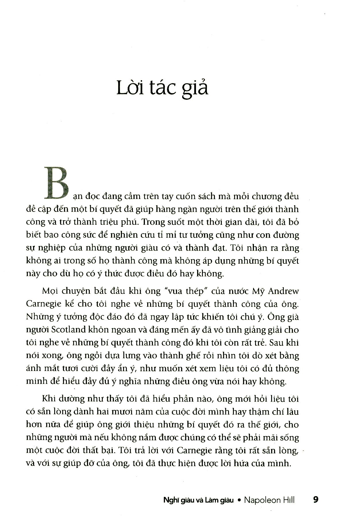 Nghĩ Giàu & Làm Giàu được viết bởi Napoleon Hill - một “cố vấn” đáng tin cậy đã thay đổi cuộc đời của hàng triệu người. Trong một cuộc gặp cơ duyên với Andrew Carnegie - Ông vua thép nước Mỹ, cuộc đời của chàng trai nghèo Napoleon Hill đã có một bước thay đổi quan trọng. Từ đây, ông bắt đầu bước trên con đường với vai trò một người trợ giúp và định hướng cho những ai muốn thành công, những ai đang gặp thất bại hoặc tuyệt vọng.