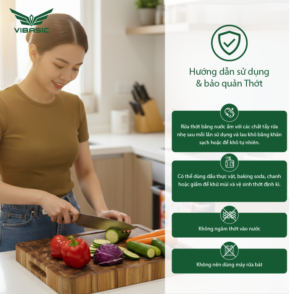 Rửa thớt bằng nước ấm với chất tẩy nhẹ sau mỗi lần sử dụng. Lau khô bằng khăn sạch hoặc để khô tự nhiên.