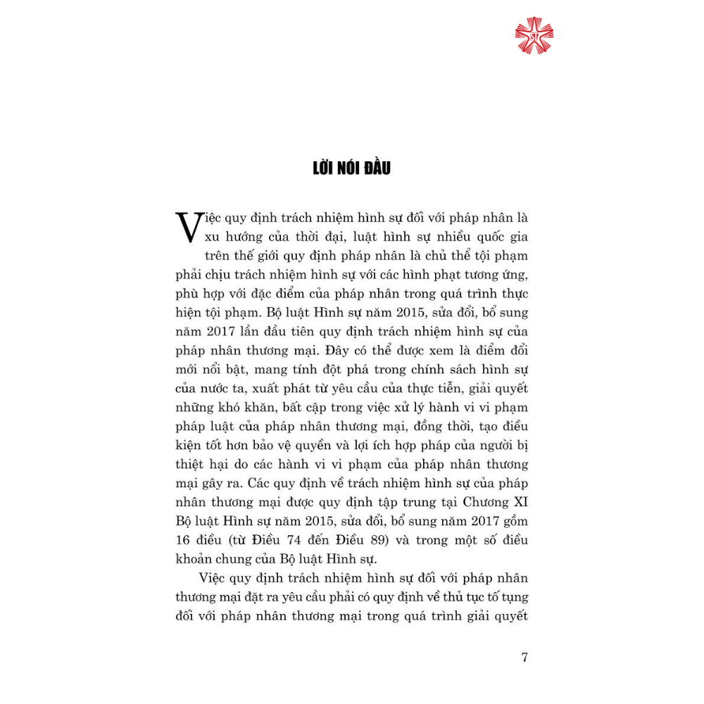 Cuốn sách bao gồm một số bài viết của các tác giả trong và ngoài nước được lựa chọn từ Hội thảo khoa học cùng tên do Khoa Luật, Đại học Quốc gia Hà Nội và Đại học Duy Tân tổ chức. Nội dung các bài viết đi sâu phân tích các quy định của Bộ luật Tố tụng hình sự năm 2015 về thủ tục truy cứu trách nhiệm hình sự đối với pháp nhân thương mại phạm tội và giới thiệu các quy định về trách nhiệm hình sự của pháp nhân một số nước trên thế giới và cách thức triển khai áp dụng quy định của các nước này.