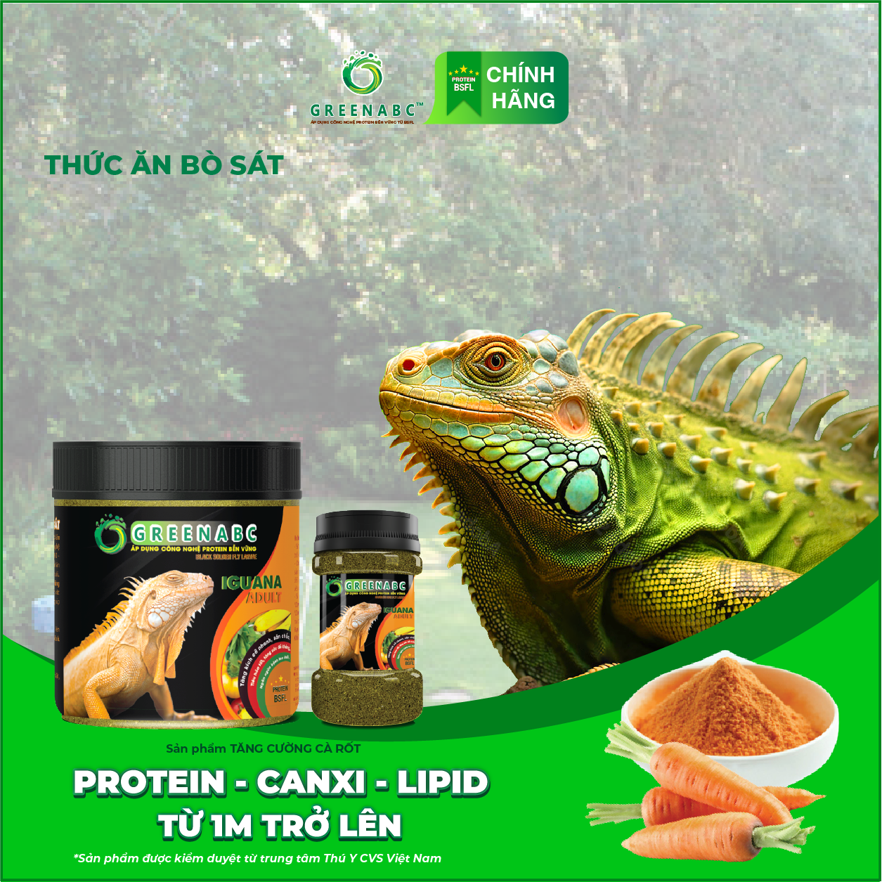 GREENABC là thức ăn cao cấp dành cho Iguana Trưởng Thành - Rồng Nam Mỹ Trưởng Thành. Đặc biệt sản phẩm GREENABC được sản xuất theo phương pháp Áp dụng công nghệ PROTEIN bền vững từ bột đạm G.Meal rất giàu PROTEIN – CANXI – LIPID có trong BSFL, đã được Mỹ (AAFCO) và EU chấp nhận đưa vào công thức cho ngành sản xuất thức ăn dành cho vật nuôi.