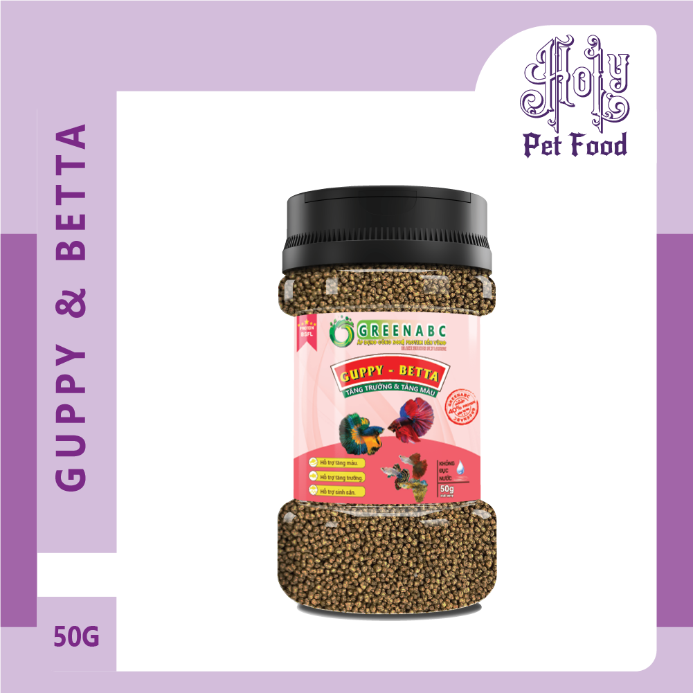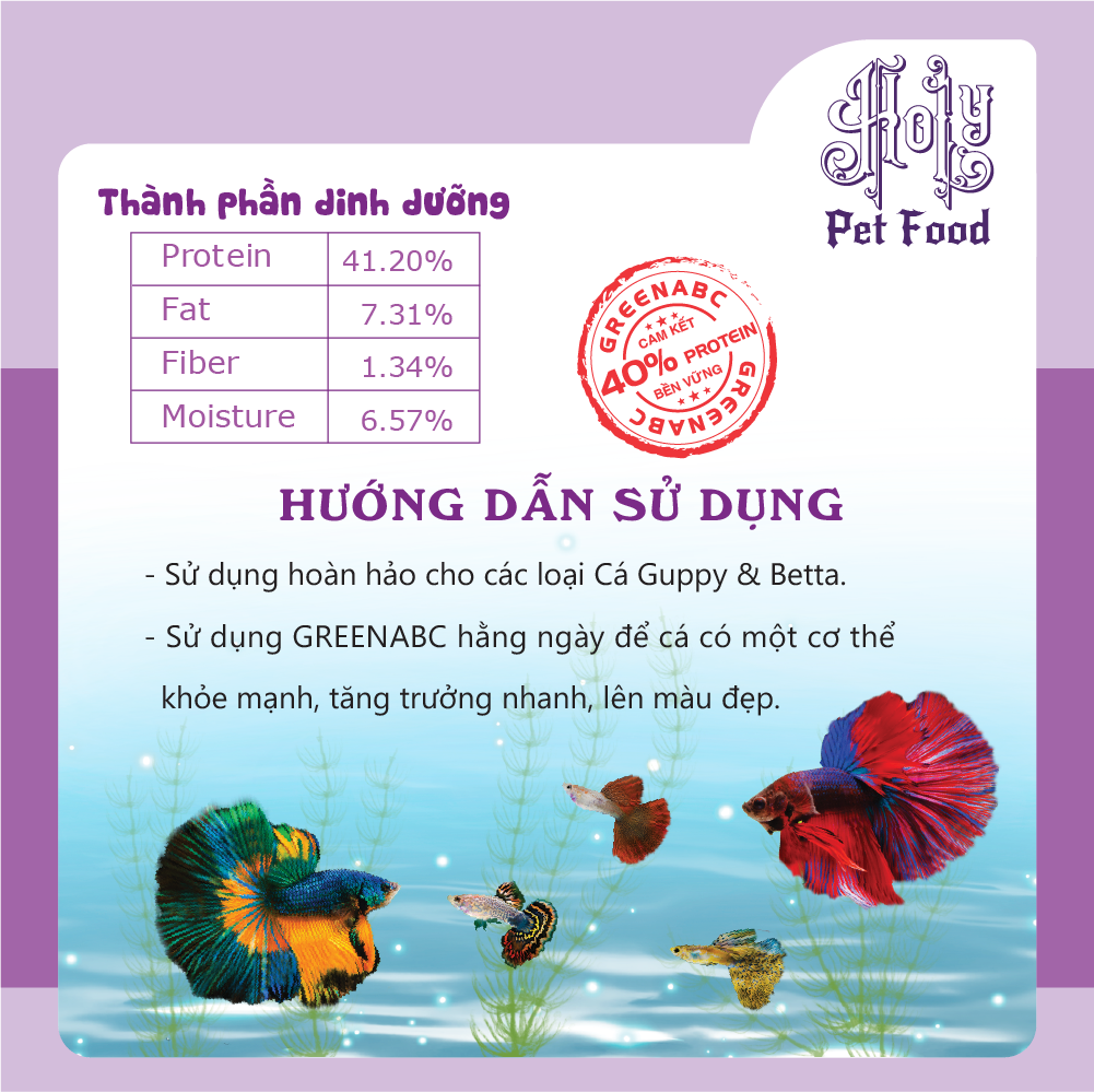 Sản phẩm GREENABC cung cấp các giá trị dinh dưỡng bền vững cho thú cưng, giúp cho Cá Guppy & Betta:       + Vảy sáng dáng đẹp, màu sắc rực rỡ tươi sáng.       + Tiêu hóa tốt, giúp cá hấp thụ các dưỡng chất cần thiết cho cơ thể phát triển toàn diện.       + Tăng sức đề kháng, giúp Cá chống lại các bệnh nấm thường gặp.       + Với hàm lượng PROTEIN > 40% giúp cá có năng lượng dồi dào, khỏe mạnh, linh hoạt.       + Không đục nước, không gây ô nhiễm nguồn nước