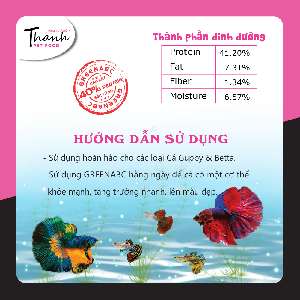 Sản phẩm GREENABC cung cấp các giá trị dinh dưỡng bền vững cho thú cưng, giúp cho Cá Guppy & Betta: