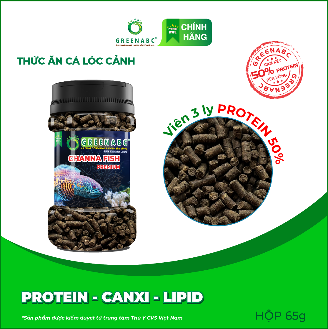 GREENABC là thức ăn bổ dưỡng viên chìm dành cho CÁ LÓC CẢNH . Đặc biệt sản phẩm GREENABC được sản xuất theo phương pháp Áp dụng công nghệ PROTEIN bền vững từ bột đạm GMeal rất giàu PROTEIN – CANXI – LIPID có trong BSFL*, đã được Mỹ và EU chấp nhận đưa vào công thức cho ngành sản xuất thức ăn dành cho vật nuôi.