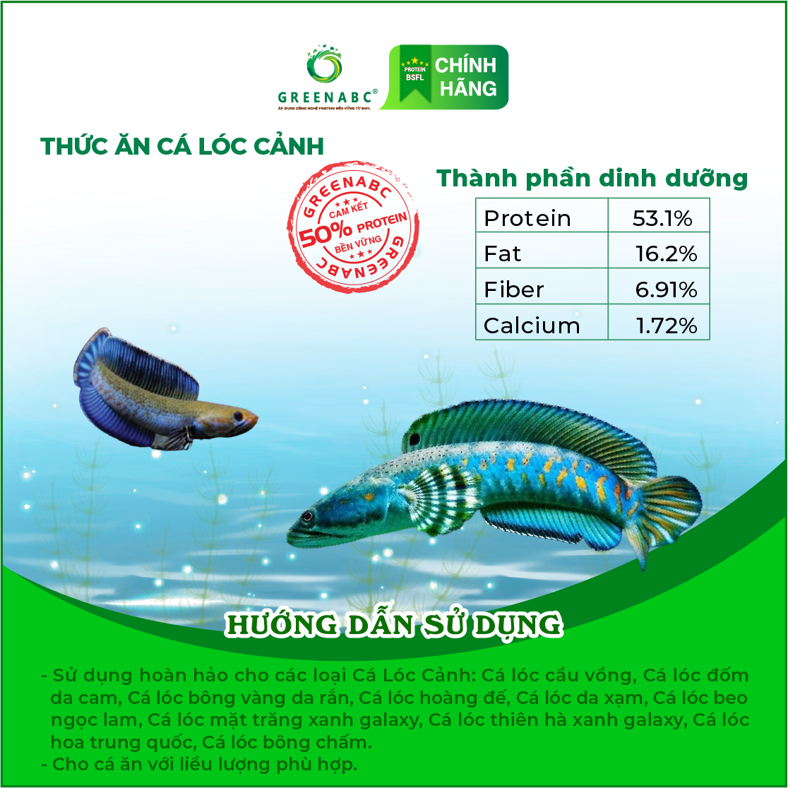 Sản phẩm GREENABC cung cấp các giá trị dinh dưỡng bền vững cho vật nuôi, giúp cho CÁ LÓC CẢNH: