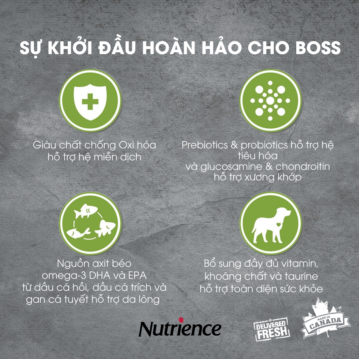- Phát triển nhận thức: Dầu hạt lanh và dầu cá hồi là nguồn DHA tự nhiên đóng vai trò quan trọng trong sự phát triển của não và hệ thần kinh chó con. Chúng tôi đảm bảo mức độ thích hợp trong mỗi túi thức ăn nhằm hỗ trợ khả năng nhận thức trong cả việc học và huấn luyện