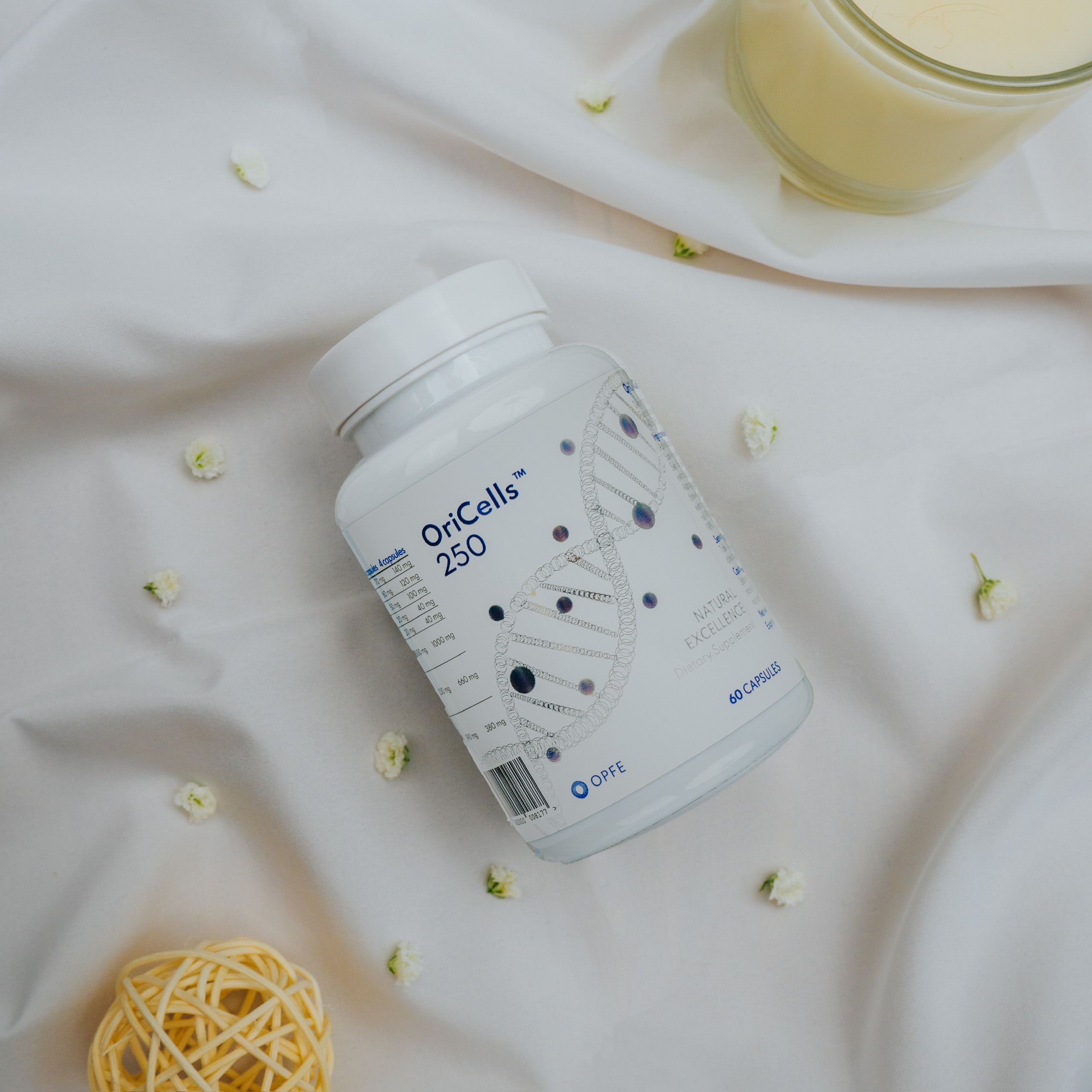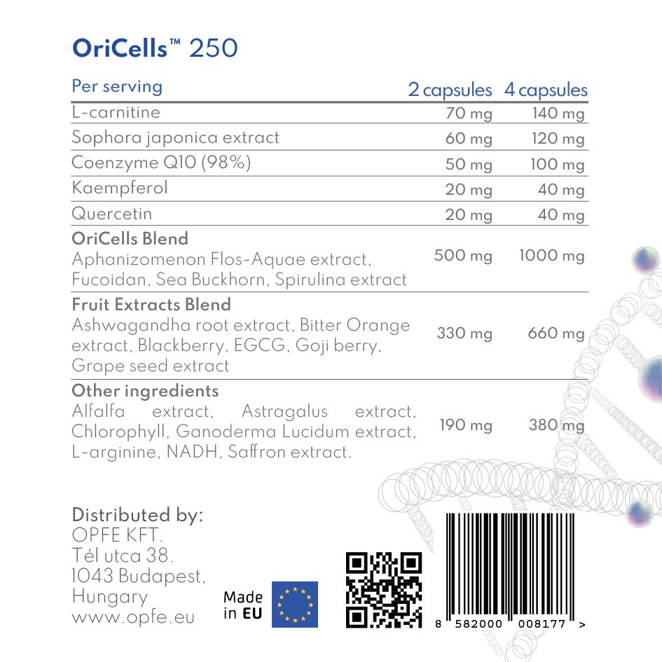 Thành phần: Chiết xuất Hoa hòe (Sophora japonica extract), Coenzyme Q10 (98%), Kaempferol, Quercetin, L-carnitine, OriCells Blend: Tảo , , Hắc Mai Biển (), Tảo xoắn (Spirulina extract), Fruit Extracts Blend: Chiết xuất rễ Sâm Ấn Độ (Ashwagandha root extract), chiết xuất Cam đắng (Bitter Orange extract), chiết xuất Quả Mâm xôi đen (Blackberry), , Kỷ tử (Goji berry), Chiết xuất Hạt nho (Grape seed extract), Thành phần khác: Chiết xuất Cỏ linh lăng (Alfalfa), Hoàng kỳ (Astragalus), Chlorophyll, Nấm linh chi (Ganoderma Lucidum), Chiết xuất Nhụy hoa Nghệ Tây (). Phụ liệu: Vỏ nang thực vật HPMC (Hydroxypropyl Methylcellulose).