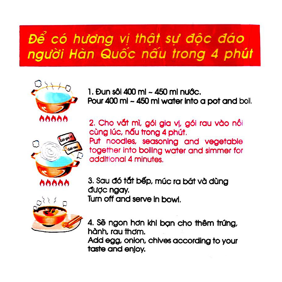 THÀNH PHẦN Bột mì (99,33%), calci carbonat (từ vỏ trứng) (0,67%) (tương đương với 0,267% hàm lượng calci nguyên tố). CÁCH DÙNG Cách 1: Nấu bằng nồi: Đun sôi nước, cho mì vào luộc trên lửa