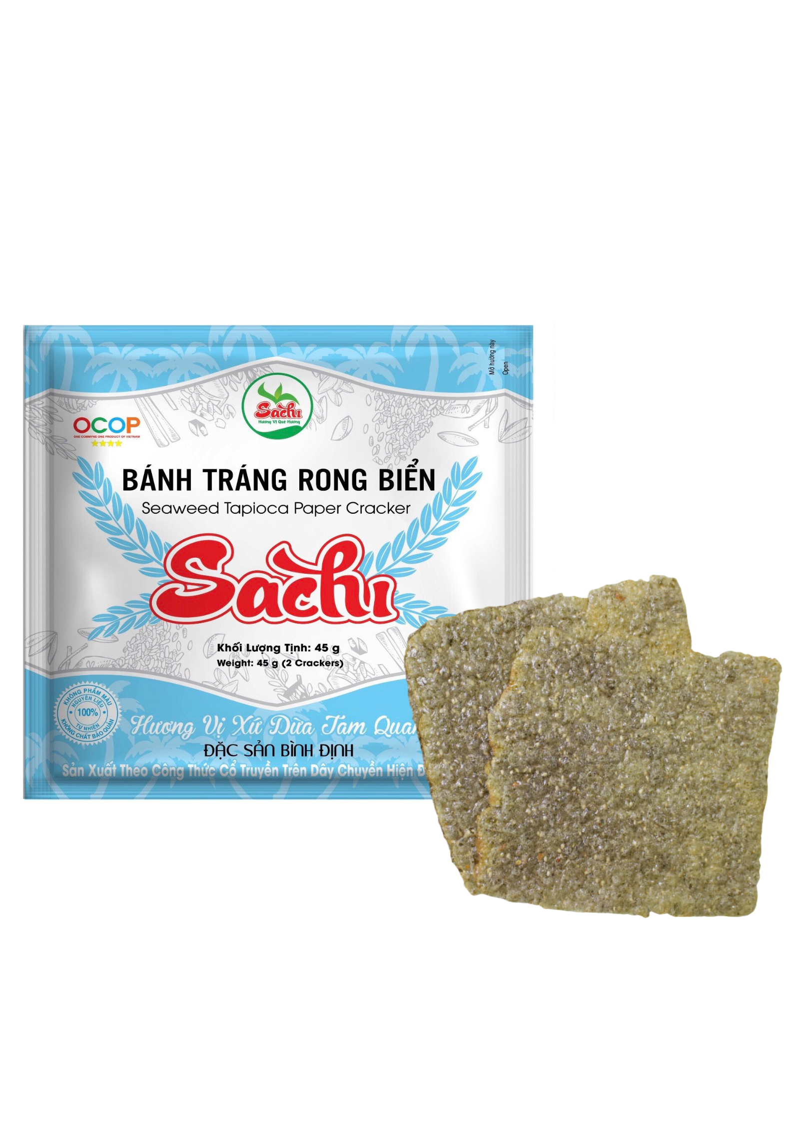 Sản phẩm bánh tráng dừa nướng tẩm rong biển của Sachi với các thành phần chính là bánh tráng dừa, nguyên liệu và nhờ có pha thêm gia vị vào cùng nên bánh có hương