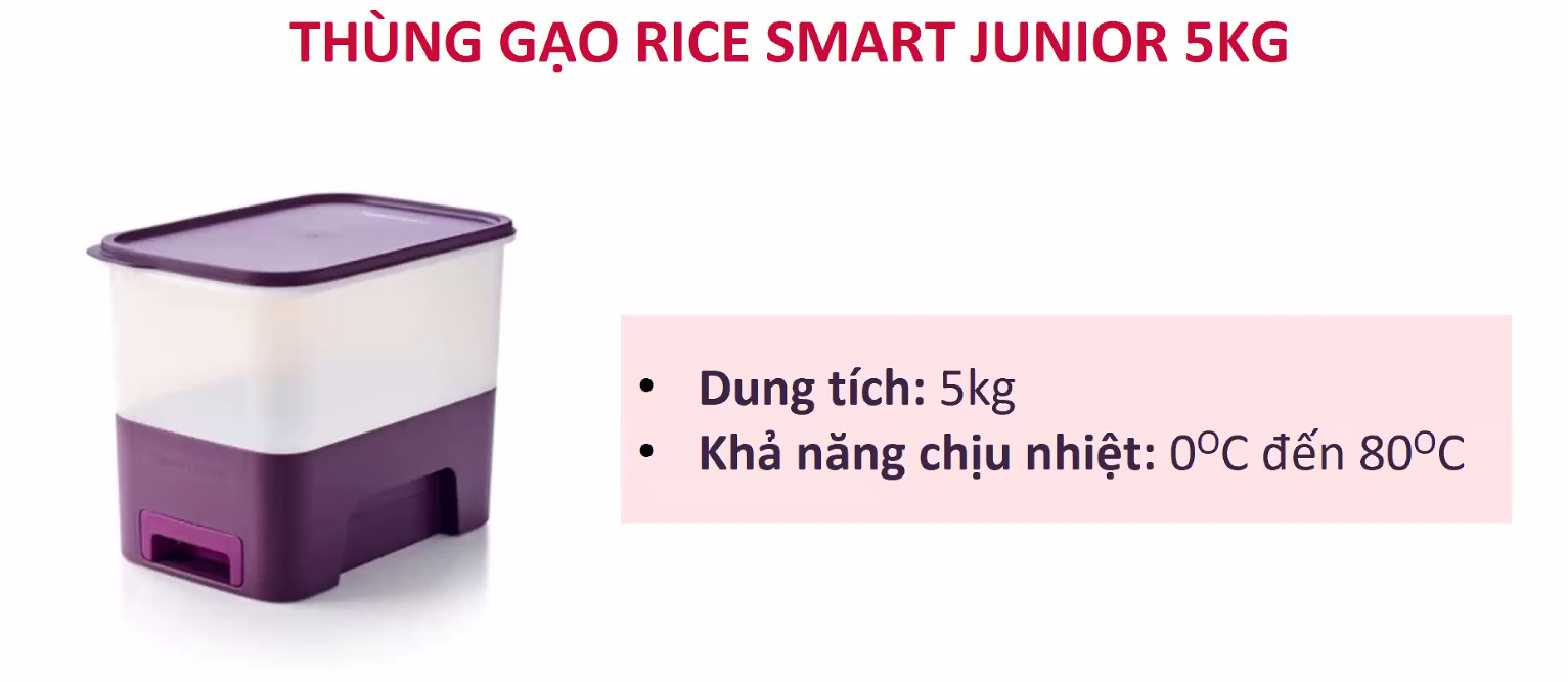 Dung tích: 5kg Kích thước: 29.4 x 19.5 x 22.8cm Nhiệt độ an toàn: 0 ~ 80⁰C   Ưu điểm và tiện ích: - Chất liệu nhựa nguyên sinh, an toàn tiếp xúc với thực phẩm - Thiết kế gọn nhẹ, phù hợp với mọi gian bếp và tiết kiệm không gian lưu trữ - Khay lấy gạo được thiết kế tinh tế giúp dễ dàng lấy gạo bằng một tay. Nguyên lý lấy gạo tuần hoàn “Vào trước – Ra trước” (First in – First out), giúp gạo trong thùng luôn tươi mới - Nắp hộp có gờ mở thuận tiện trong việc đóng, mở hộp - Thiết kế cửa sổ mặt trước nhựa trong, giúp dễ dàng nhìn thấy mức gạo được chứa bên trong.  - Thiết kế lõm hai bên hông của thùng gạo giúp an toàn cầm nắm bằng hai tay khi thùng gạo chứa đầy Công dụng: - Với dung tích nhỏ gọn 5kg, sản phẩm thùng gạo Rice Smart Junior phù hợp với việc bảo quản các loại thực phẩm như gạo, nếp, gạo lứt, hạt dinh dưỡng,… Hướng dẫn cách tháo: - Bước 1: Mở nắp thùng gạo - Bước 2: Lắp khay đựng gạo ra khỏi phần đáy - Bước 3: Lấy phần thân ra khỏi đáy - Bước 4: Lấy miếng nhựa trắng ra khỏi phần thân - Bước 5: Lấy thanh trượt ra khỏi phần đáy Hướng dẫn cách lắp: - Bước 1: Lắp thanh trượt vào phần đáy - Bước 2: Lắp khay đựng gạo vào khe ở phần đáy - Bước 3: Lắp miếng nhựa trắng vào thân - Bước 4: Lắp phần thân vào đáy - Bước 5: Cho gạo vào - Bước 6: Đậy nắp thùng gạo Cách bảo quản: - Rửa sạch và để khô thùng gạo lần đầu tiên sử dụng - Bảo quản thùng gạo nơi khô thoáng, sạch sẽ - Không dùng được trong tủ đông hoặc lò vi sóng, máy hấp tiệt trùng - Dùng an toàn trong máy rửa chén dưới 65 ͦC - Tránh chùi rửa bằng vật sắc nhọn - Không tiếp xúc hoặc để gần nguồn lửa để tránh nóng chảy, biến dạng