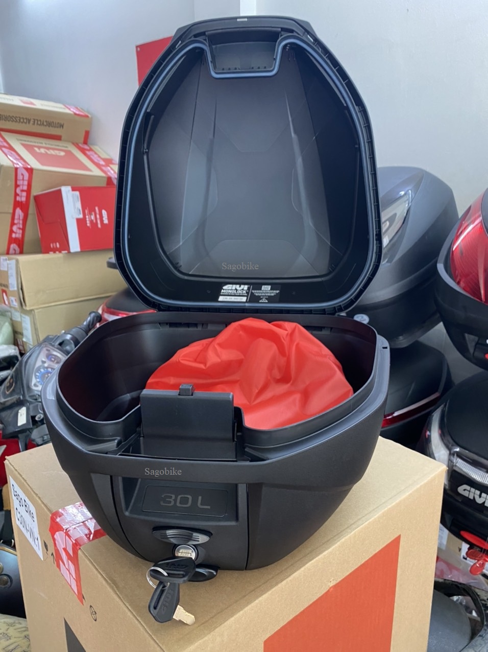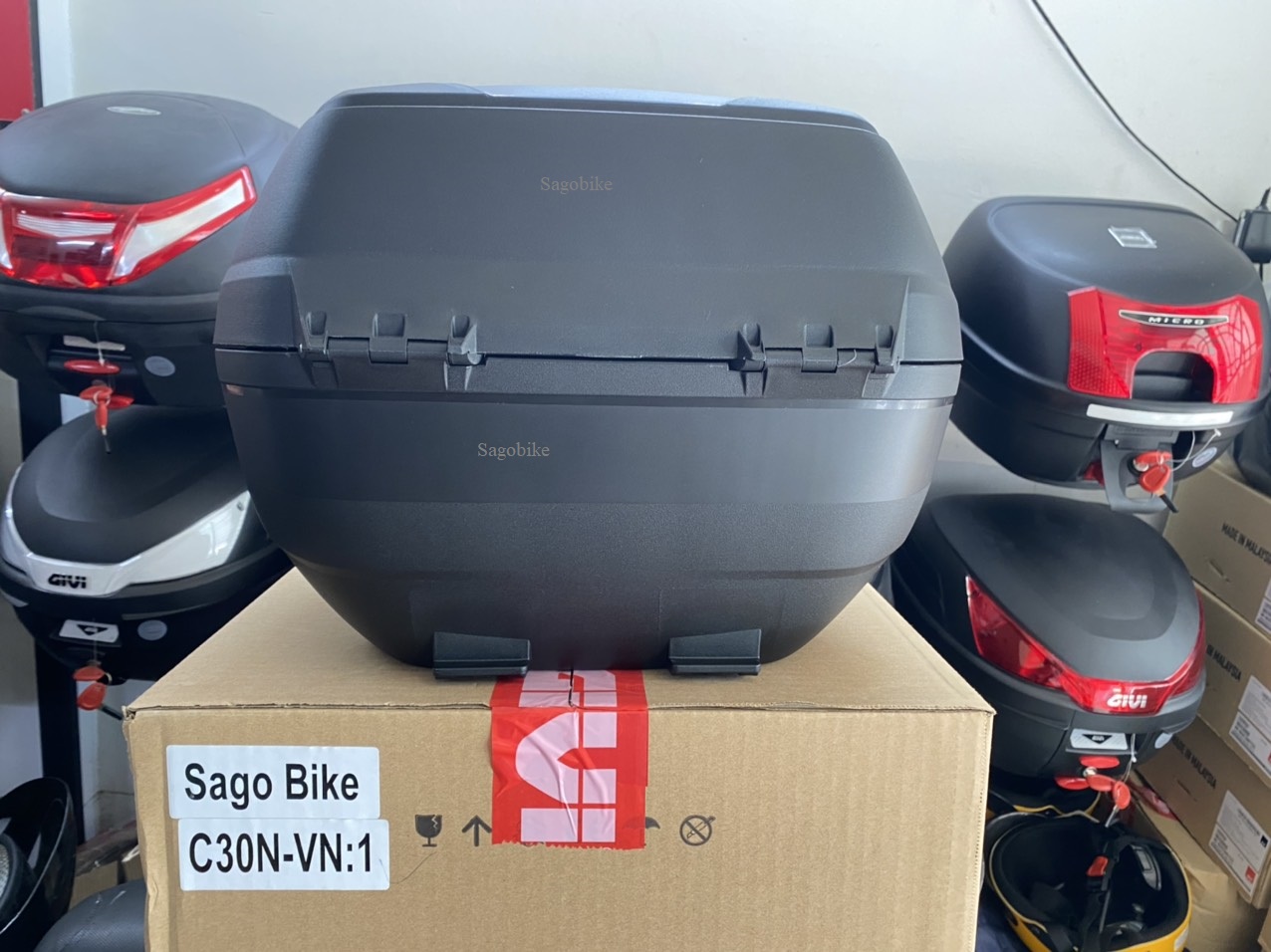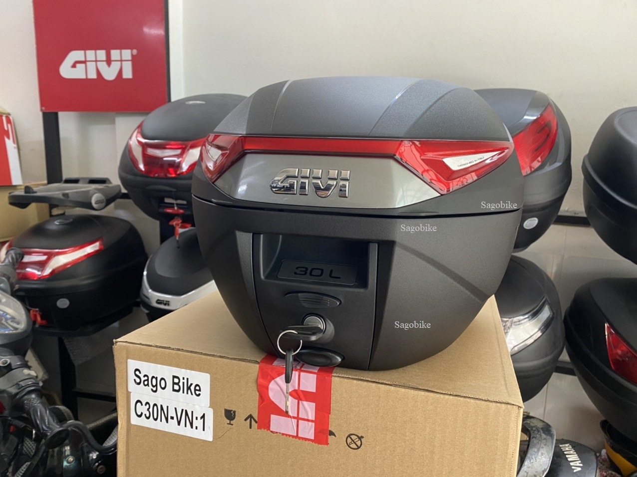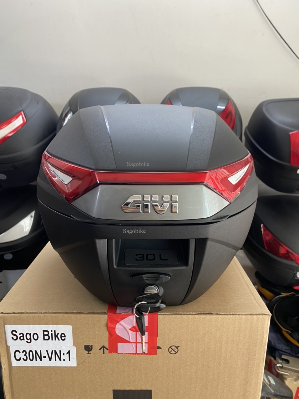 Thùng Givi C30N mẫu thùng mới ra mắt vào 5/2022 của Givi, mang thiết kế của Ý sang trọng, chất liệu nhựa nguyên sinh PP siêu bền, C30 có kiểu dáng bo tròn, phần nhựa meca có dòng chữ in chìm Desighned Italy, phía trước nắp thùng in chữ Givi bao quanh bởi chóa đèn, thùng sử dụng dòng khóa mới, ấn nút nhẹ nhàng, toàn bộ nút khóa và khóa sử dụng tông đen, bộ thùng đi kèm 2 chìa khóa, điểm mới của ổ khóa lần này sản xuất theo công nghệ Ý, với đường zik zak tăng tính an toàn cho bộ thùng, phôi chìa cứng cáp hơn, xịn hơn. Thành thùng phía dưới được dập khuôn 2 nấc, giúp đóng khóa thùng kín hơn, phần nắp thùng có vân nổi chạy dọc thân thùng, tăng tính thẩm mỹ và giúp thùng cứng cáp, chịu lực tốt hơn. Đế nhựa MP60N theo thùng được gói trong túi đỏ, có hai dây đeo, vừa đẹp tiện và tái sử dụng như một túi xách thực thụ