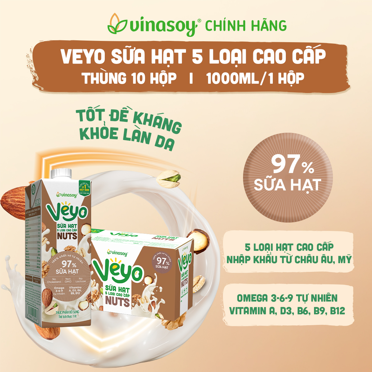 - VEYO SỮA HẠT 5 LOẠI CAO CẤP nguồn dinh dưỡng trọn vẹn từ ÓC CHÓ, HẠNH NHÂN, MẮC CA, YẾN MẠCH, DẺ CƯỜI mang đến vị ngọt dịu nhẹ, bùi béo tự nhiên, hòa