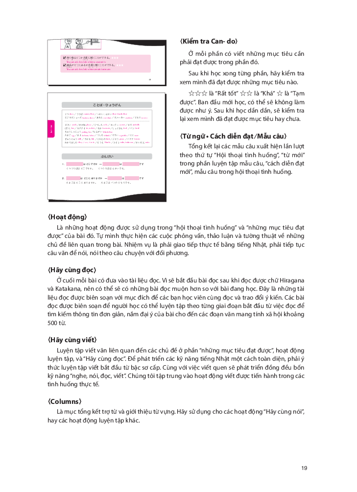 Giáo trình được biên soạn nhằm giúp người học giao tiếp bằng tiếng Nhật tốt hơn trong các hoạt động xã hội. Các tình huống học tập trong giáo trình là những tình huống thường được sử dụng để giao tiếp trên thực tế, được lựa chọn từ các lĩnh vực trong đời sống sinh hoạt, trường học và xã hội. Cách học được tổ chức theo hình thức đặc biệt ưu tiên việc "Giao tiếp" hơn là "Hiểu" từ vựng và ngữ pháp. [Hội thoại tình huống -> Xác nhận mẫu câu -> Luyện tập mẫu câu -> Hội thoại ứng dụng] Giáo trình bao gồm 2 sách giáo khoa sơ cấp 1, 2, hai quyển Work book sơ cấp 1,2 và 1 quyển Bản dịch và giải thích ngữ pháp.