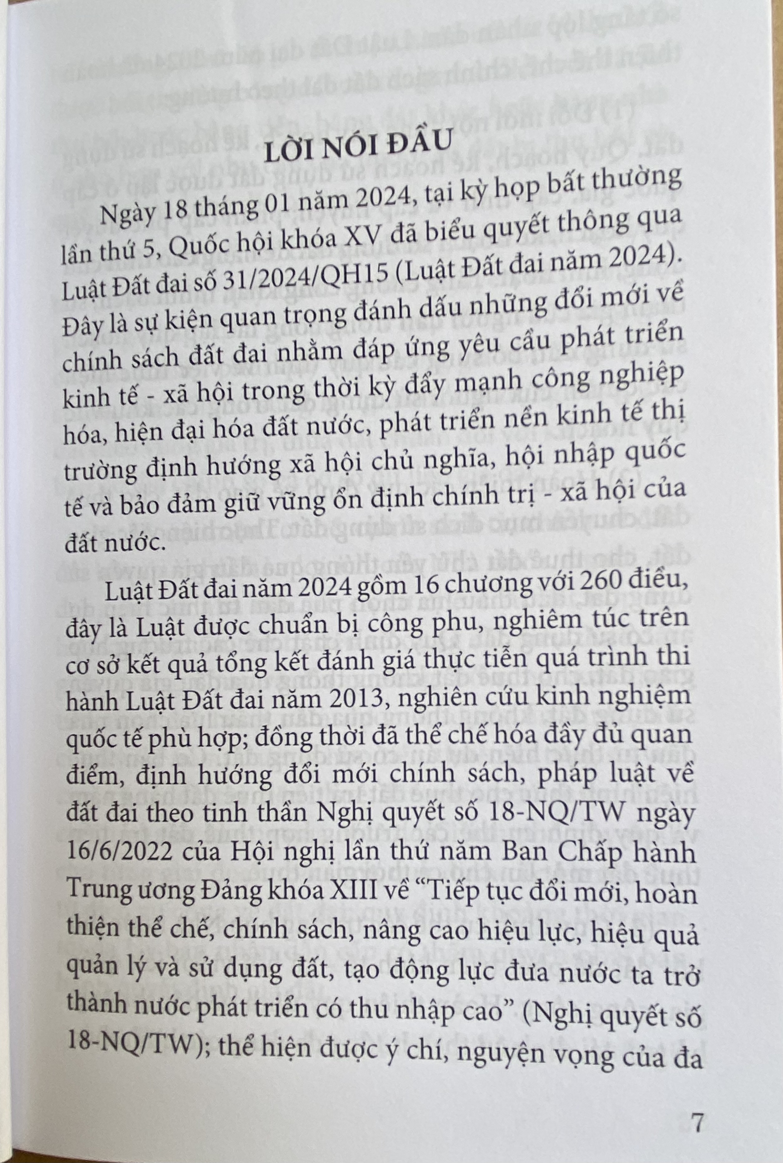 Luật Đất đai số 31/2024/QH15 được Quốc hội khóa XV thông qua ngày 18/01/2024. Luật Đất đai năm 2024 gồm 16 chương, 260 điều, trong đó sửa đổi, bổ sung 180 điều của Luật