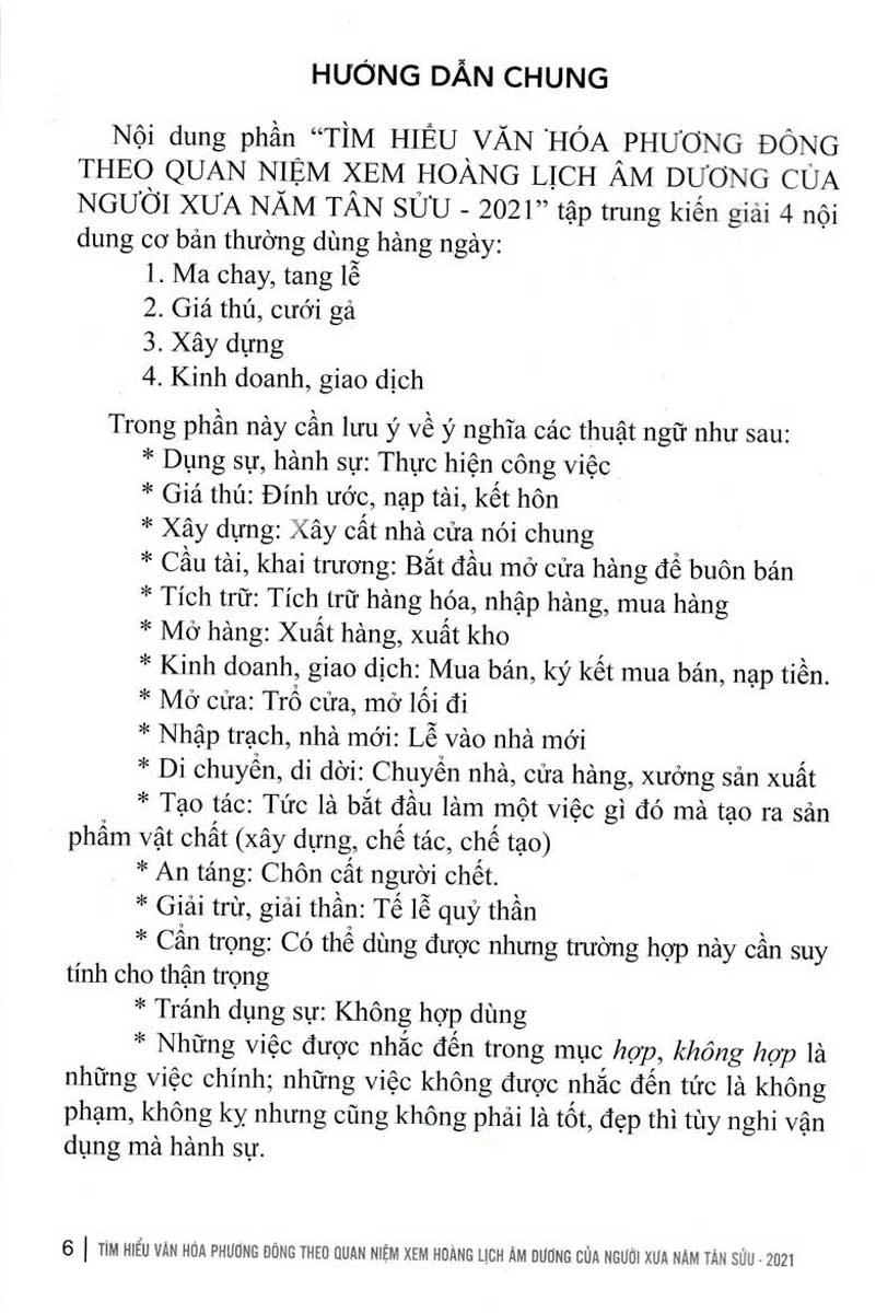 Cuốn ''TÌM HIỂU VĂN HÓA PHƯƠNG ĐÔNG THEO QUAN NIỆM XEM HOÀNG LỊCH ÂM DƯƠNG CỦA NGƯỜI XƯA NĂM TÂN SỬU - 2021'' bao gồm 2 phần: Phần thứ nhất: Là các vấn đề đại cương về việc xem sao, chọn ngày, chọn giờ tốt xấu; phần 2: Là đại cương về việc chọn ngày, giờ cụ thể của năm