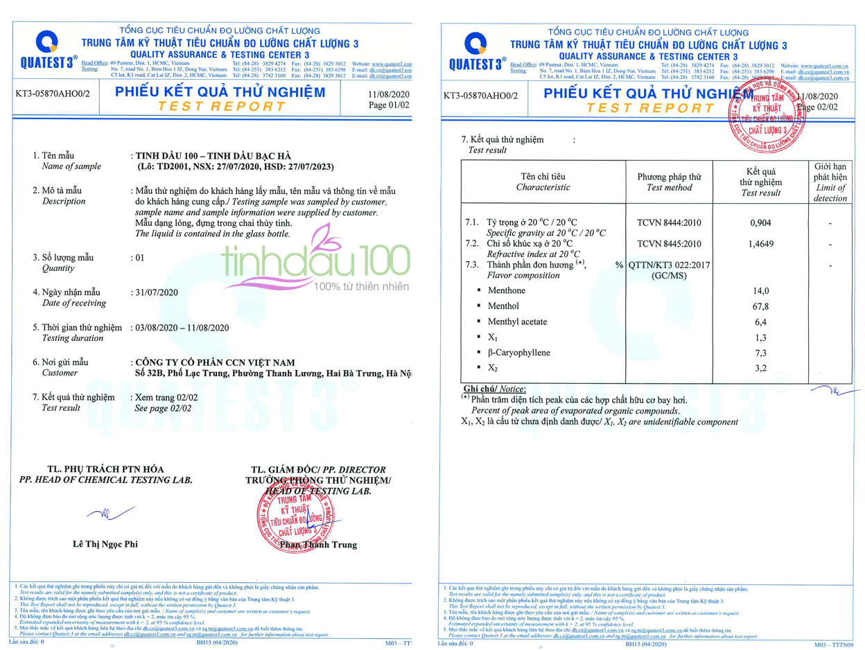 Thành phần chính của tinh dầu Bạc Hà:– Chiết xuất từ cây bạc hà bằng phương pháp lôi cuốn hơi nước.– Tinh chất Menthol và menthone là 2 thành phần chính của tinh dầu Bạc
