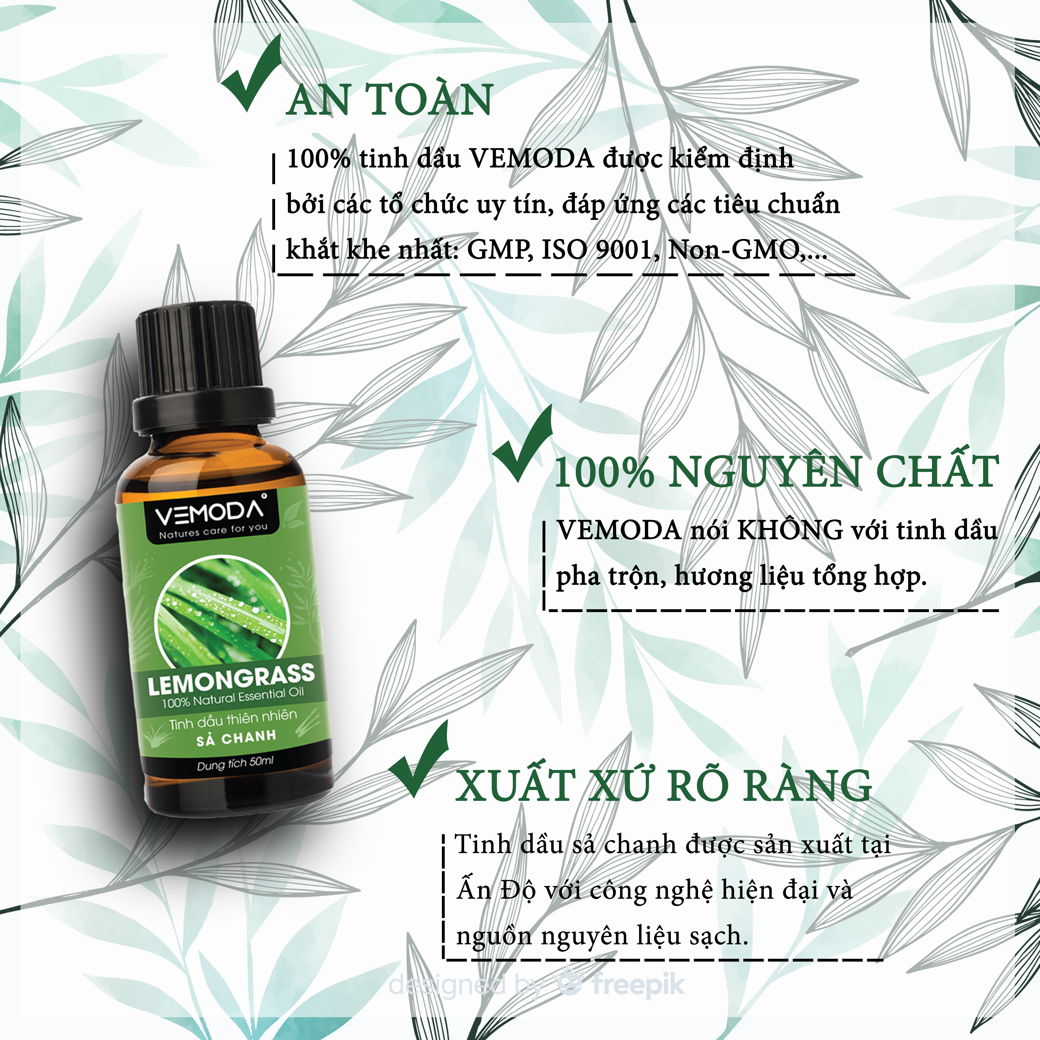 TINH DẦU SẢ CHANH CAO CẤP VEMODA 100ML Tinh dầu Sả chanh cao cấp Vemoda giúp khử mùi, xua đuổi côn trùng, chống trầm cảm, giải cảm, làm đẹp Tinh dầu Sả chanh cao cấp