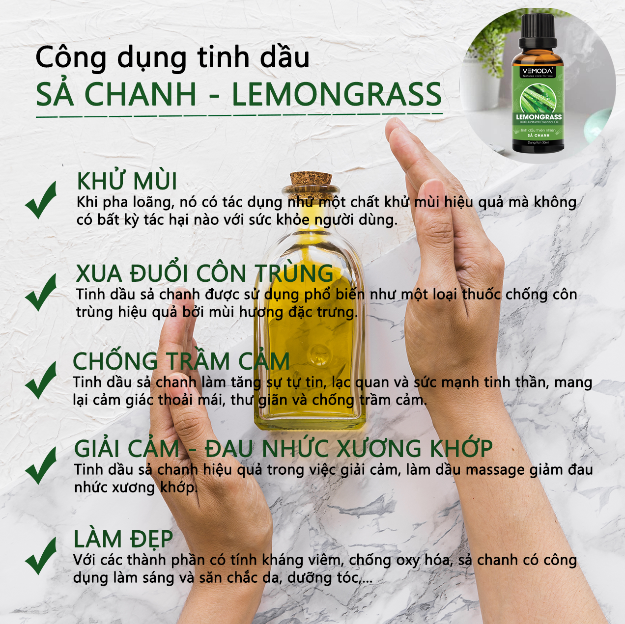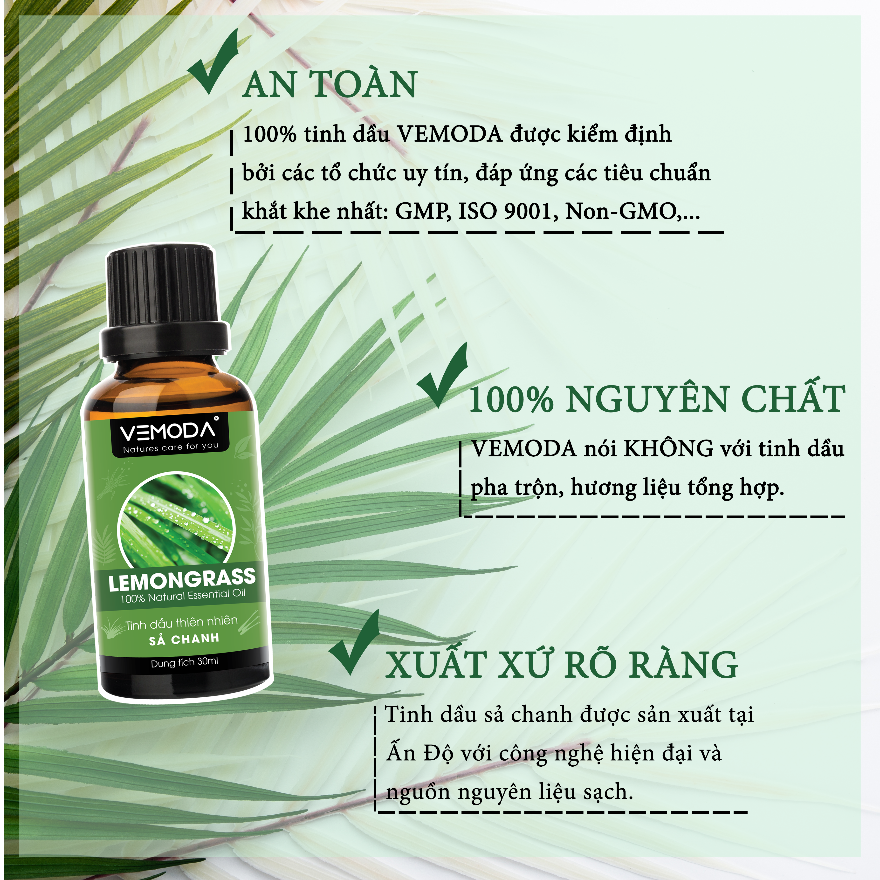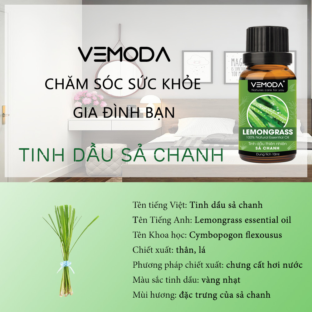 TINH DẦU SẢ CHANH CAO CẤP VEMODA 100ML Tinh dầu Sả chanh cao cấp Vemoda giúp khử mùi, xua đuổi côn trùng, chống trầm cảm, giải cảm, làm đẹp Tinh dầu Sả chanh cao cấp