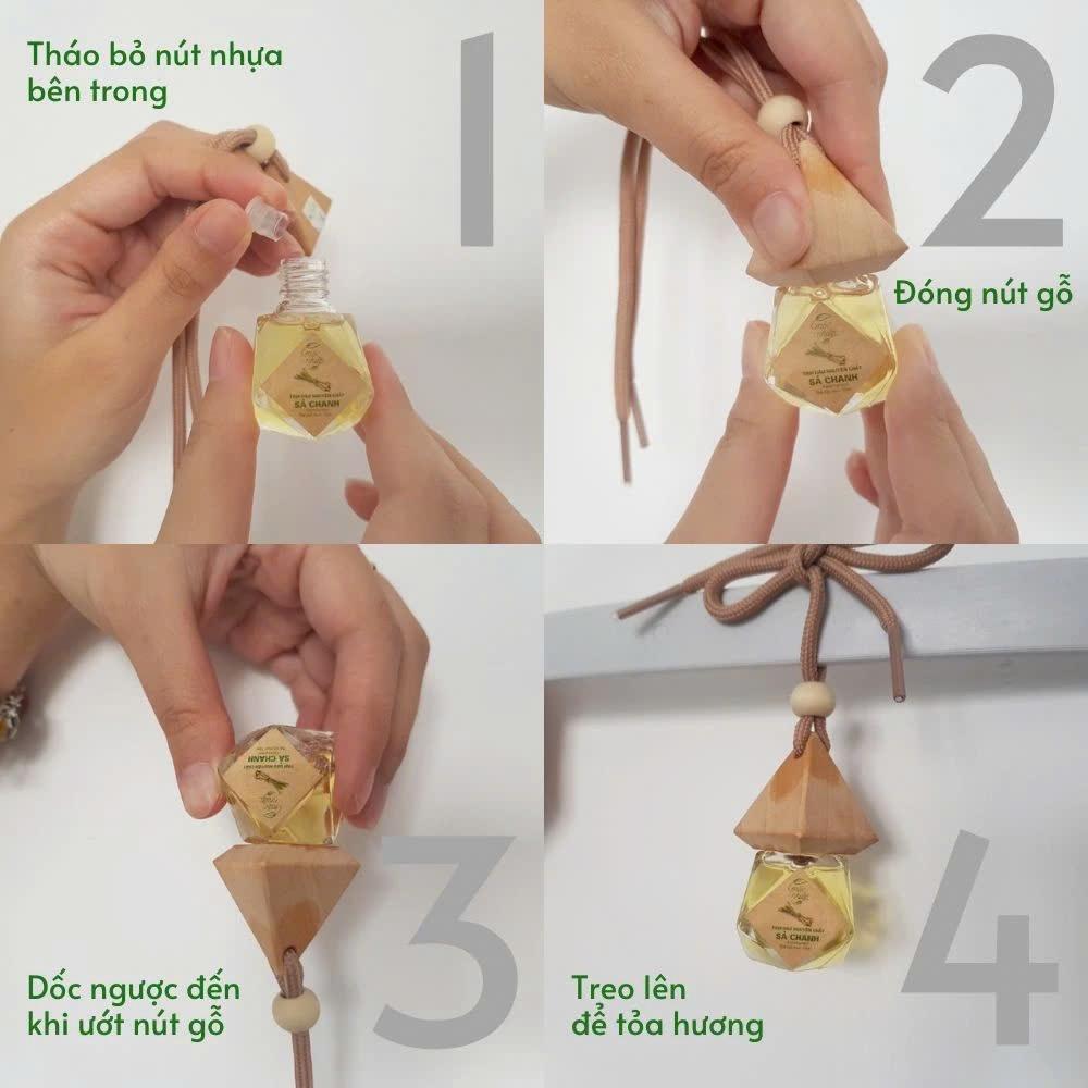 Bỏ nút nhựa phía trong và nắp lại nắp gỗ, dốc ngược lại vài lần cho tinh dầu thấm vào nắp gỗ sau đó treo lên vị trí của oto bạn thích nhất.