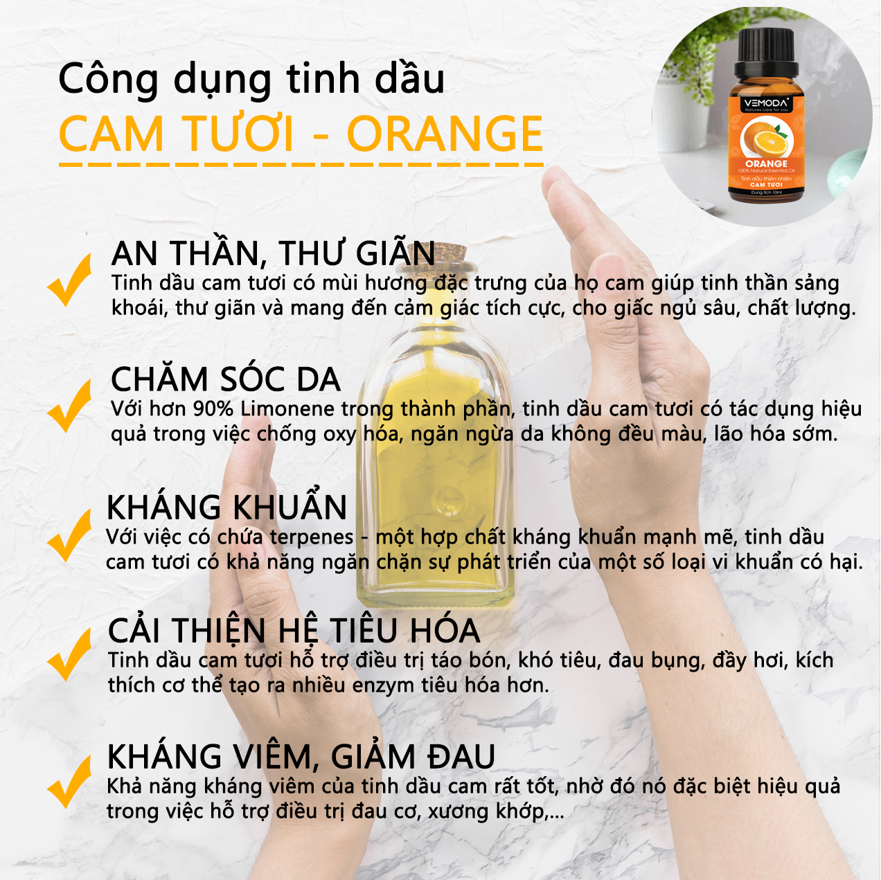 - Tinh dầu Cam tươi: tạo cảm giác tinh thần thoải mái, thư giãn, khử mùi, thanh lọc không khí, đuổi muỗi và côn trùng, massage,hỗ trợ chữa ngạt mũi, giải cảm, nâng cao chất lượng giấc ngủ.