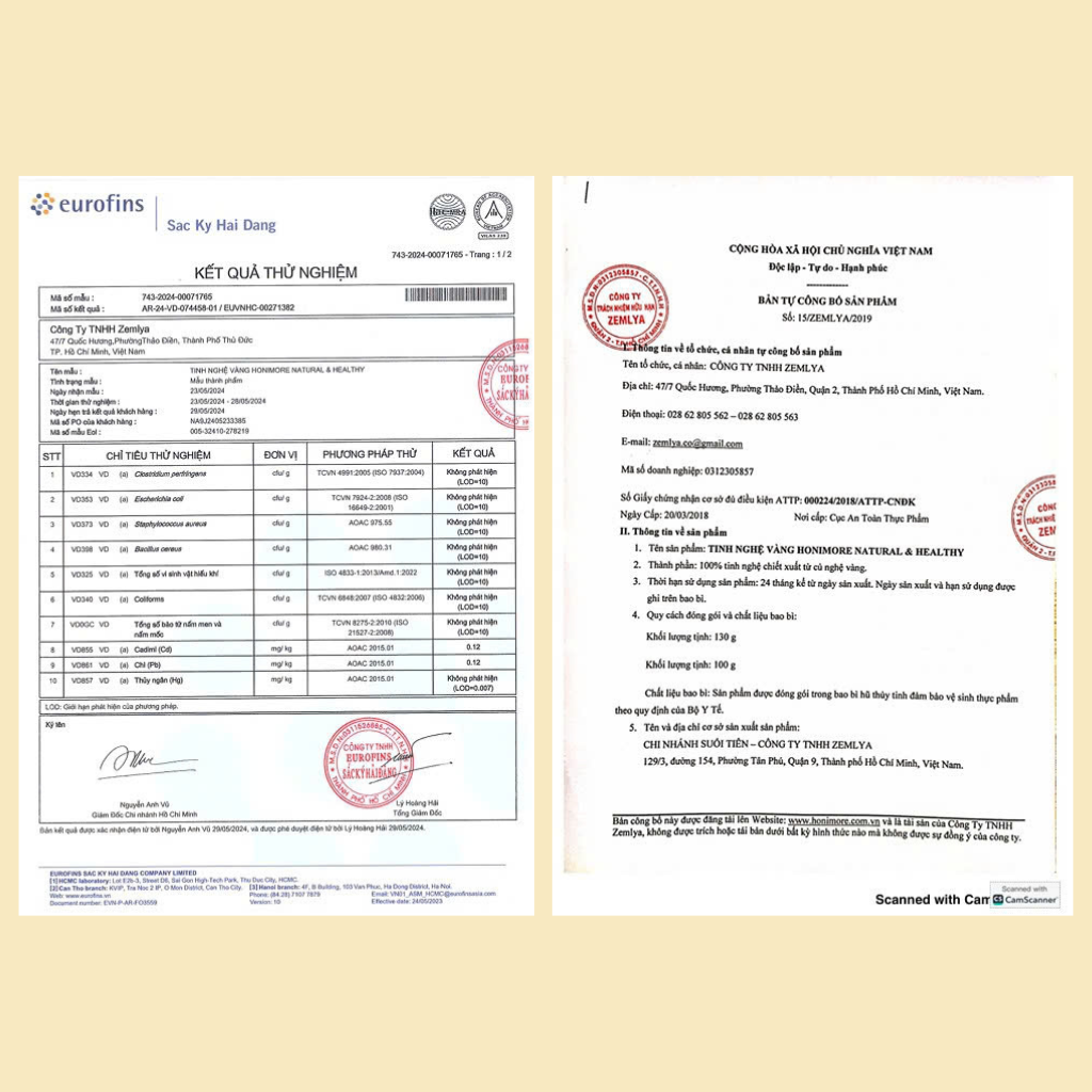 - Tinh nghệ vàng nguyên chất Honimore được làm từ những củ nghệ tẻ, màu vàng sáng, hoàn toàn không chứa chất bảo quản, chất độn và hương liệu. Trải qua quá trình loại bỏ vỏ, dầu nghệ, một số các tạp chất và thu về tinh nghệ nguyên chất có hợp chất curcumin cao.