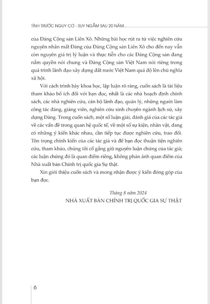 Tính Trước Nguy Cơ - Suy Ngẫm Sau 20 Năm Đảng Cộng Sản Liên Xô Mất Đảng Cuốn sách Tính Trước Nguy Cơ – Suy Ngẫm 20 Năm Đảng Cộng Sản Liên Xô Mất Đảng là kết quả của đề tài “Nghiên cứu bài học lịch sử của việc Đảng Cộng sản Liên Xô mất Đảng” của Viện Khoa học xã hội Trung Quốc và sau đó đã được đưa vào dự án thuộc Quỹ khoa học xã hội nhà nước của Trung Quốc. Đứng từ góc độ nhà nghiên cứu đồng thời là đảng viên ở một nước do Đảng Cộng sản nắm quyền, lãnh đạo, trên quan điểm của chủ nghĩa Mác, cuốn sách đi sâu phân tích một cách khoa học, logic những nhóm nguyên nhân chính dẫn đến sự suy yếu trong lãnh đạo, cầm quyền của Đảng Cộng sản Liên Xô, những điều rút ra từ việc nghiên cứu bài học mất Đảng của Đảng Cộng sản Liên Xô cho đến nay vẫn còn nguyên giá trị lý luận và thực tiễn đối với các đảng cộng sản đang nắm quyền. Với cách trình bày khoa học, lập luận rõ ràng, cuốn sách là tài liệu tham khảo bổ ích đối với bạn đọc, nhất là các nhà hoạch định chính sách, các nhà nghiên cứu, cán bộ lãnh đạo trung và cao cấp, những người làm công tác đảng, học giả, giảng viên, nghiên cứu sinh chuyên ngành lịch sử, xây dựng Đảng