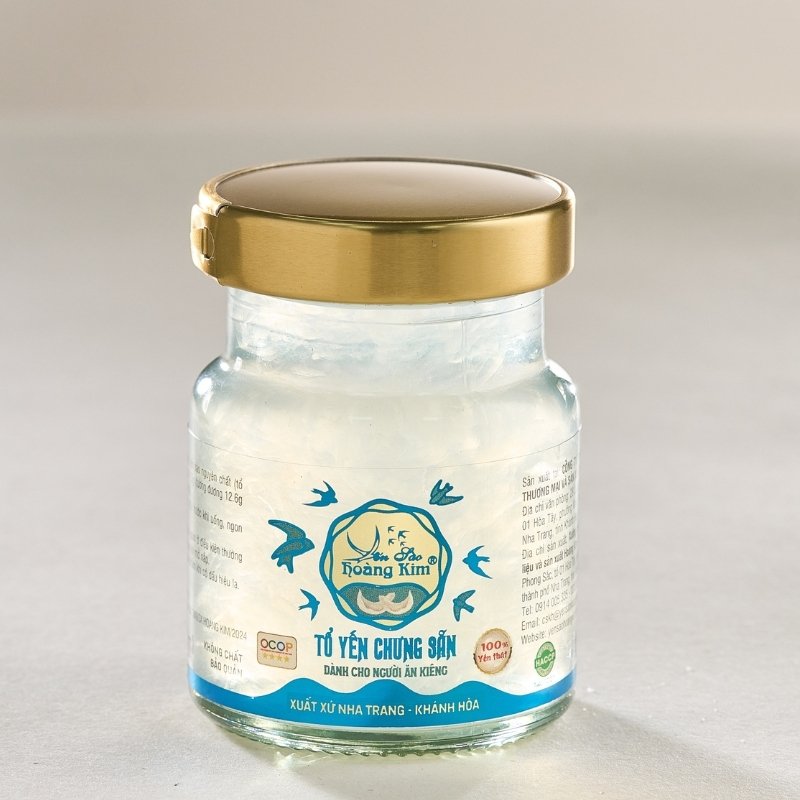 Yến Sào Hoàng Kim - Giải Pháp Dinh Dưỡng Lành Mạnh Cho Người Ăn Kiêng & Tiểu Đường Việc duy trì chế độ ăn uống lành mạnh không còn là một thử thách khi đã có Tổ Yến Chưng Sẵn Dành Cho Người Ăn Kiêng từ Yến Sào Hoàng Kim. Sản phẩm được nghiên cứu đặc biệt, hoàn toàn không sử dụng đường, thay thế bằng vị ngọt tự nhiên từ cỏ ngọt. Đây là lựa chọn hoàn hảo để bổ sung dinh dưỡng, tăng cường sức khỏe mà không gây ảnh hưởng đến cân nặng hay chỉ số đường huyết. Điểm Vượt Trội Của Sản Phẩm: -     Vị Ngọt Tự Nhiên, An Toàn Từ Cỏ Ngọt: Sản phẩm sử dụng 100% chiết xuất cỏ ngọt tự nhiên để tạo vị ngọt, không chứa calo, là lựa chọn lý tưởng cho người đang trong chế độ ăn kiêng, giảm cân hoặc cần kiểm soát đường huyết. -     Chất Lượng Được Nhà Nước Bảo Chứng OCOP 4 Sao: Được UBND tỉnh Khánh Hòa chứng nhận OCOP 4 sao năm 2024, khẳng định chất lượng và độ an toàn của sản phẩm. -     An Toàn Tuyệt Đối - Không Chất Bảo Quản: Sản xuất theo quy trình đạt chuẩn quốc tế HACCP , cam kết không sử dụng chất bảo quản, đảm bảo sự tinh khiết và an toàn cho người dùng. -     Hỗ Trợ Sức Khỏe & Vóc Dáng: Cung cấp nguồn dưỡng chất quý giá từ yến sào nguyên chất, giúp cơ thể khỏe mạnh, tỉnh táo mà không làm bạn đi chệch hướng khỏi mục tiêu vóc dáng của mình. Thông Tin Chi Tiết Sản Phẩm: Thương hiệu: Yến Sào Hoàng Kim Xuất xứ: Việt Nam Thành phần: Nước (68.5g), yến sào nguyên chất (1.5g yến khô, tương đương 12.6g yến tươi), cỏ ngọt, gừng tươi. Đối tượng sử dụng: Người ăn kiêng, người cần kiểm soát đường huyết, người theo đuổi lối sống lành mạnh. Hướng dẫn sử dụng: Lắc đều trước khi uống, ngon hơn khi uống lạnh. Nên dùng hết sau khi mở nắp. Hạn sử dụng: 12 tháng.