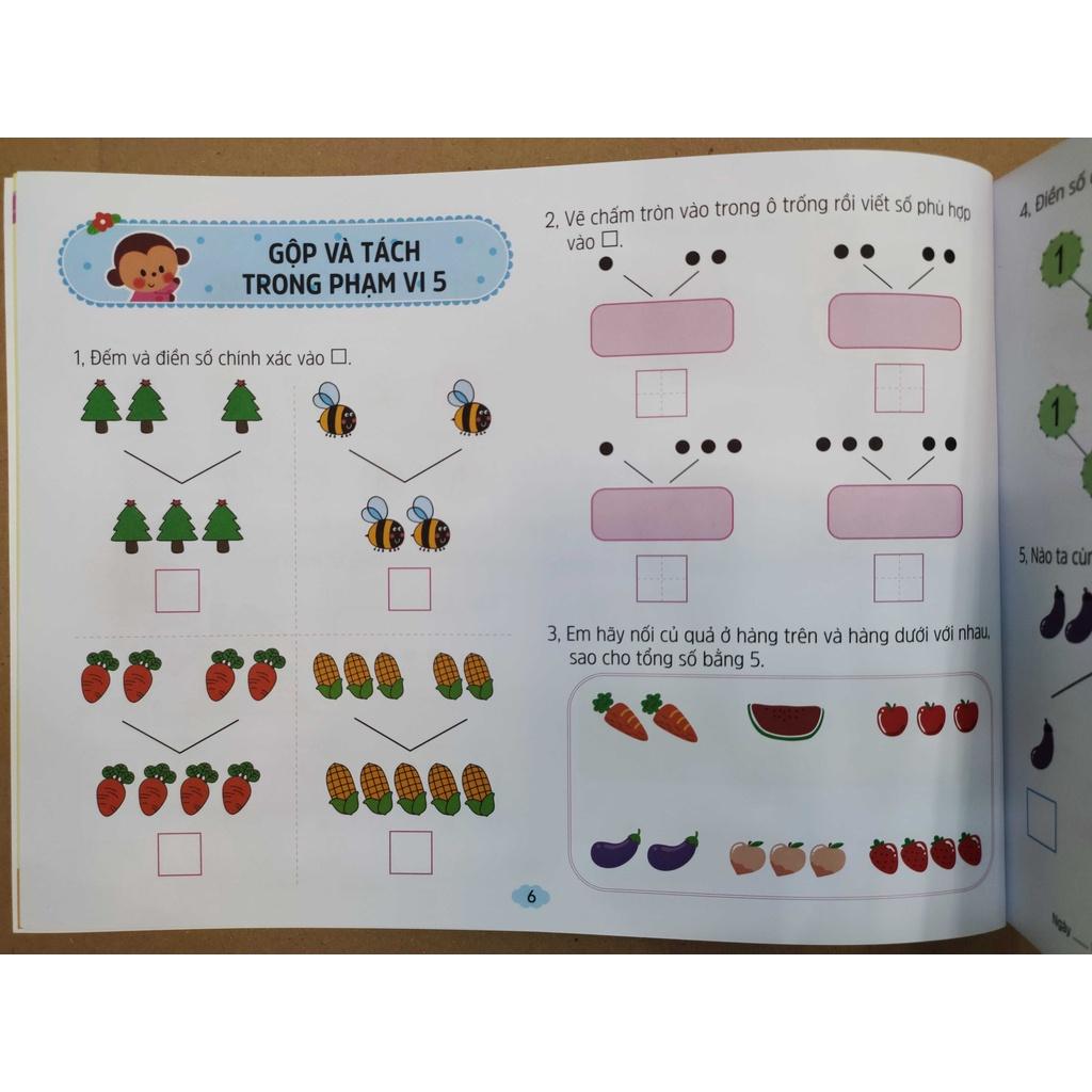 Bộ sách còn mang đến nhiều hoạt động đầy hứng thú, lôi cuốn như: vẽ, tô màu, khoanh, nối… lồng ghép vào để trẻ vừa được chơi vừa được rèn luyện tư duy, hoàn thiện kỹ năng cầm bút, làm quen với tập hợp số, giải toán và đặc biệt tạo dựng tình yêu toán học ở trẻ