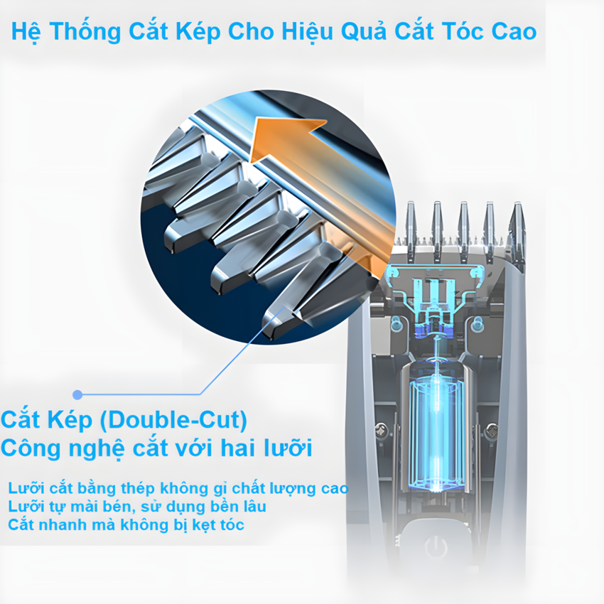 - Động cơ tốc độ cao quay tới 5.500 vòng/phút, mang lại lực cắt mạnh, mượt mà không bị kẹt tóc. Lưỡi dao chất lượng cao, bền lâu