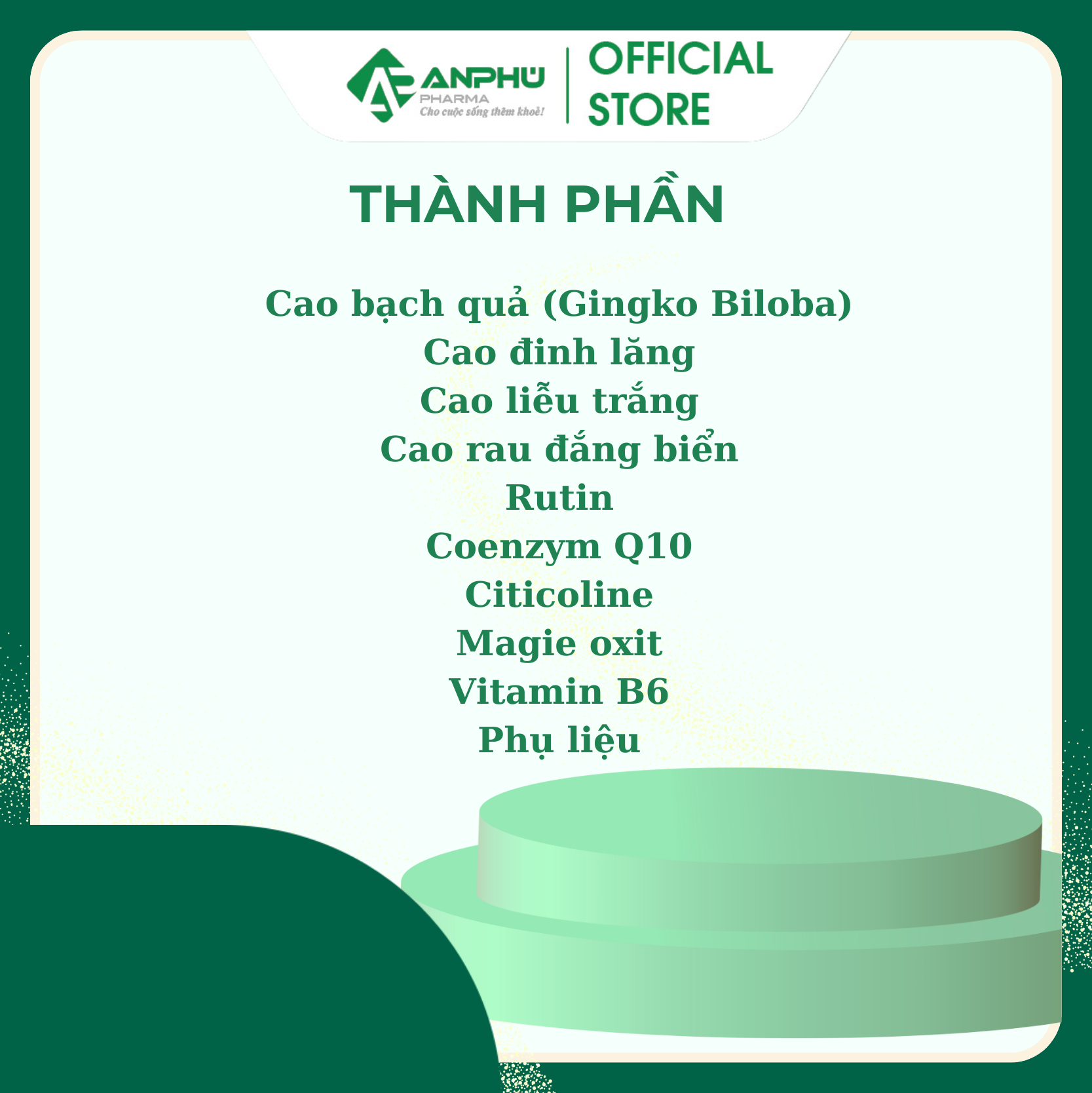 - Uống 1 viên/lần, ngày 2-3 lần LƯU Ý Phụ nữ có thai và cho con bú, rong kinh, người có hội chứng máu chậm đông, người đang xuất huyết, người huyết áp đang cao, người chuẩn bị phẫu thuật không được dùng. Không dùng cho người mẫn cảm với bất kỳ thành phần nào của sản phẩm này PHÂN PHỐI Phân phối tại: Công ty TNHH Thương mại Dược phẩm An Phú Số đăng ký sản phẩm: 8464/2019/ĐKSP