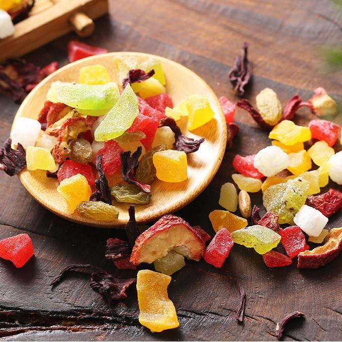 Thành phần: Hoa Hibicus khô (10%), quả sơn tra (10%), trái cây nhiệt đới (chuối, đào, kiwi, táo, dứa, dâu, xoài, chanh…) sấy khô (80%).