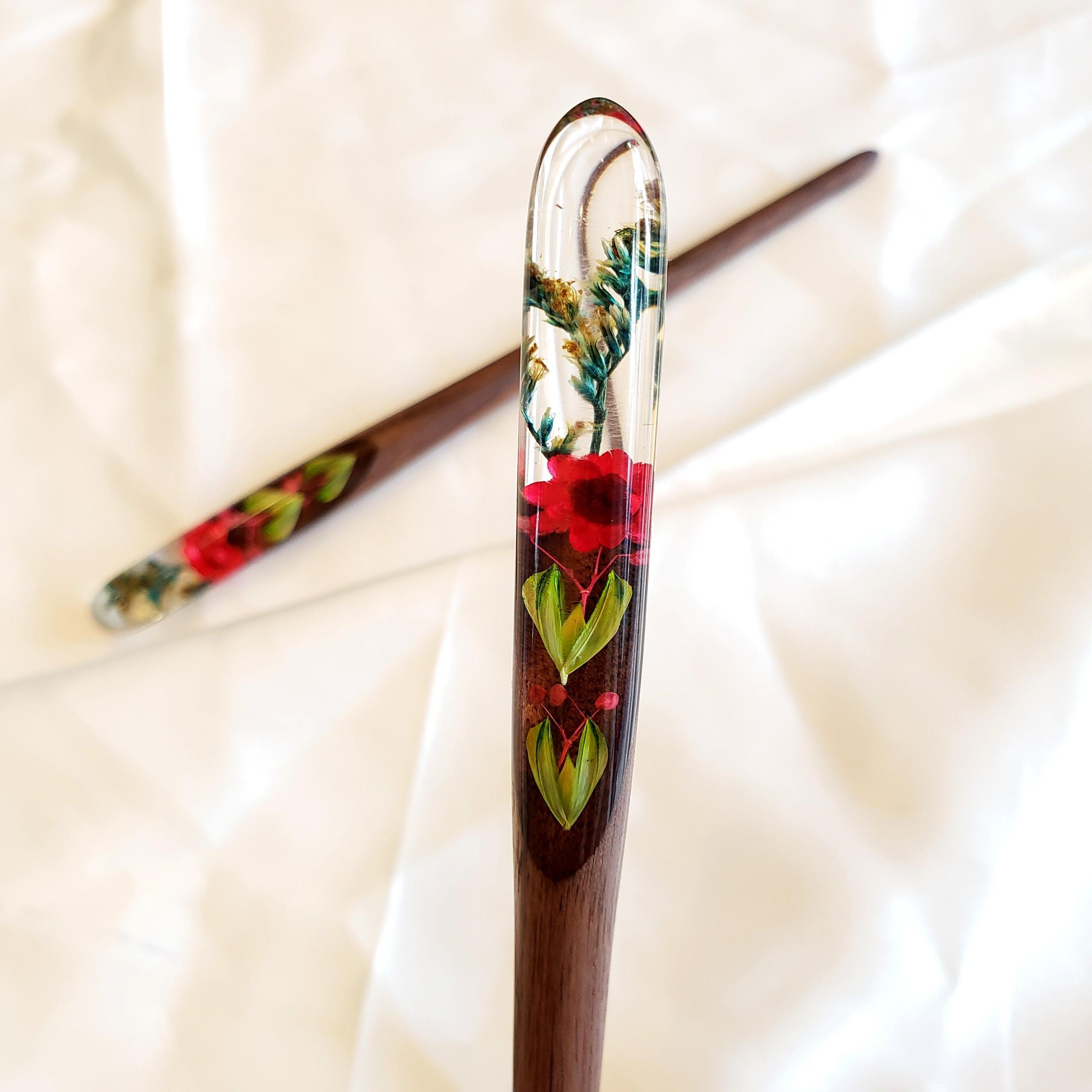 ✨Trâm cài tóc gỗ- resin & hoa snowy đỏ