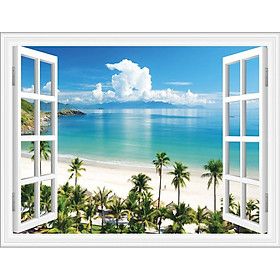 ✨Tranh dán tường 3D phong cảnh biển cửa sổ - VẢI LỤA phủ kim sa (kích thước theo yêu cầu)