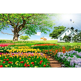 ✨Tranh dán tường 3D phong cảnh Hoa tulip - vải lụa kim tuyến
